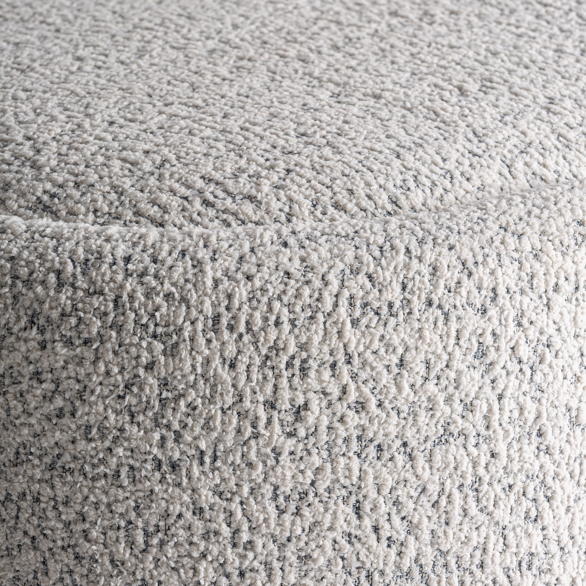 El Pie de cama Cades, aporta un gesto escultórico gracias a su diseño curvo y su tapizado jaspeado en blanco roto.