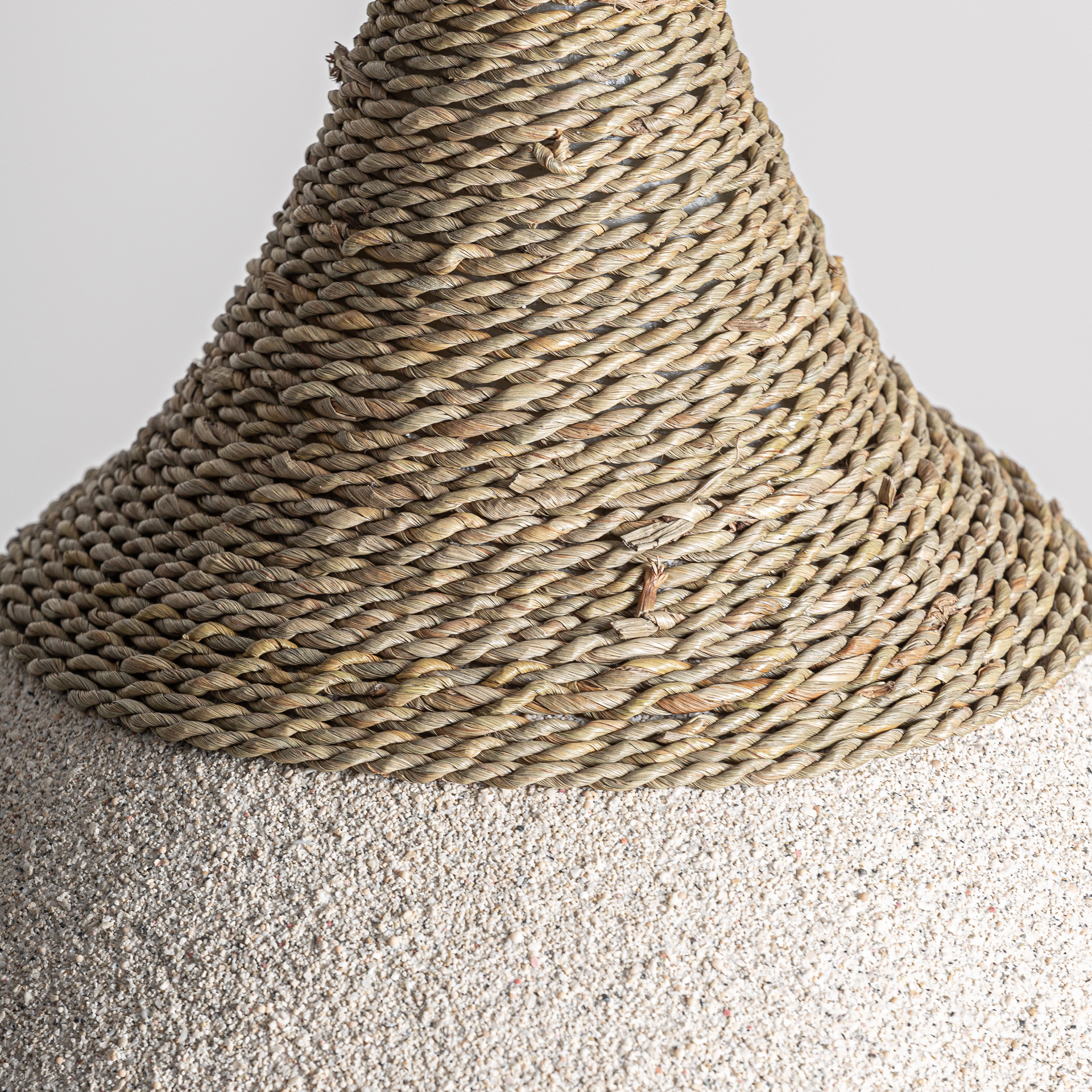 La Lámpara de Colgar Nyland destaca por su estética rústica y su volumen orgánico. Fabricada en resina crema con acabado rugoso y rematada con yute en tono arena, aporta calidez y un toque artesanal ideal para ambientes acogedores.