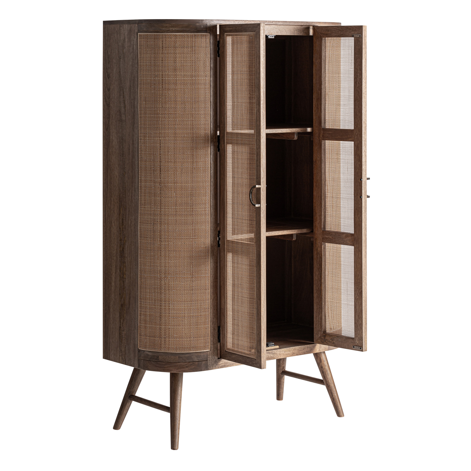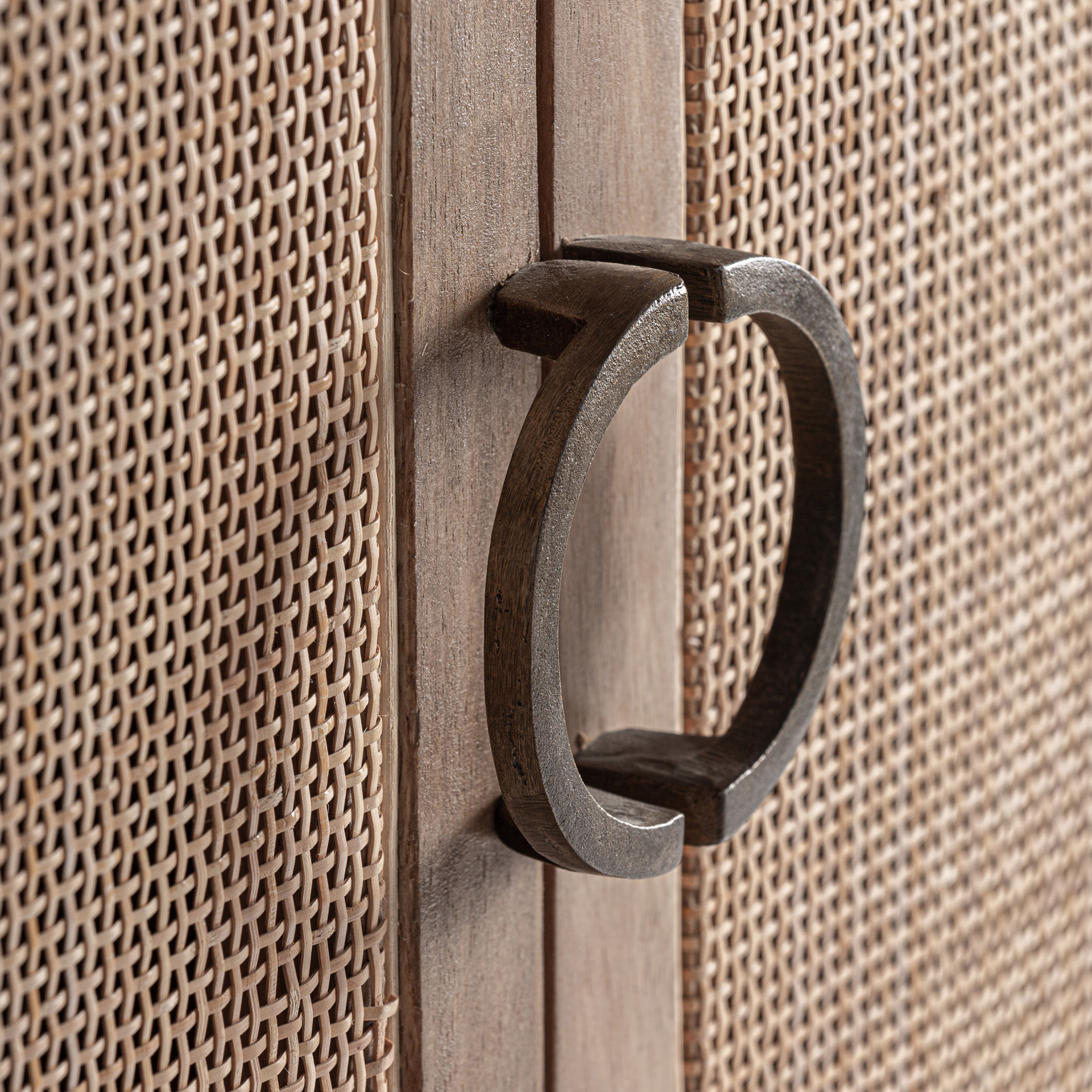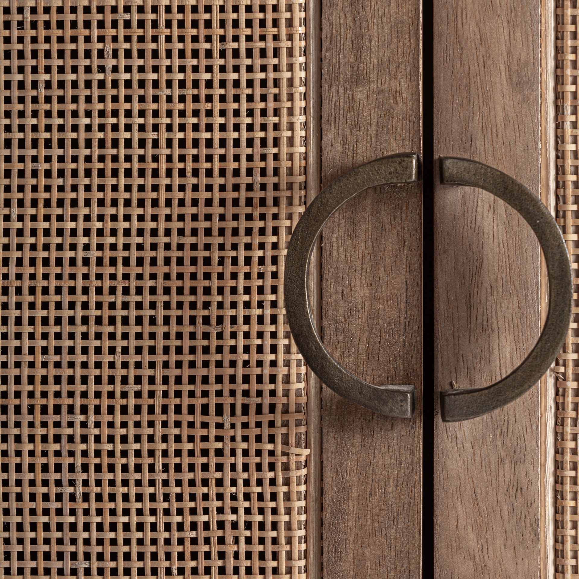 La cómoda S. Beckley combina la calidez de la madera de mango en tono marrón con la ligereza del mimbre natural en color marrón claro, creando una pieza equilibrada