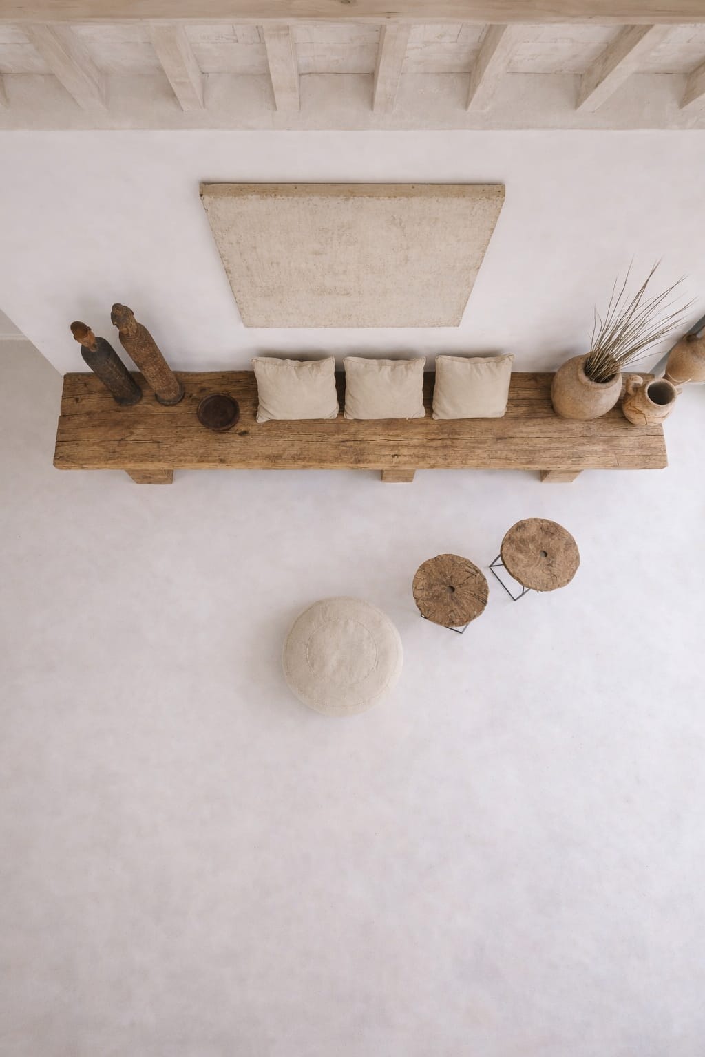 Banco Akira allado y trabajado artesanalmente, cada banco respeta la textura, las vetas profundas y las marcas naturales propias de la madera. Su diseño robusto, apoyado sobre bloques macizos, convierte la materia en arquitectura.
