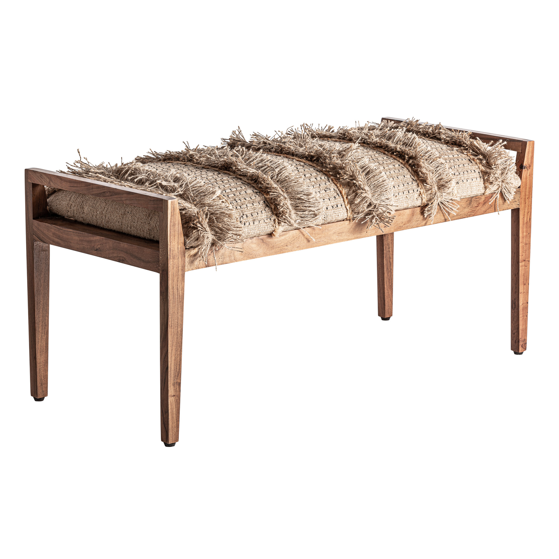Banco Corao de estilo boho, fabricado en madera de mango en color marrón claro, combinado con algodón en color tonos en marrón y yute en color beige.