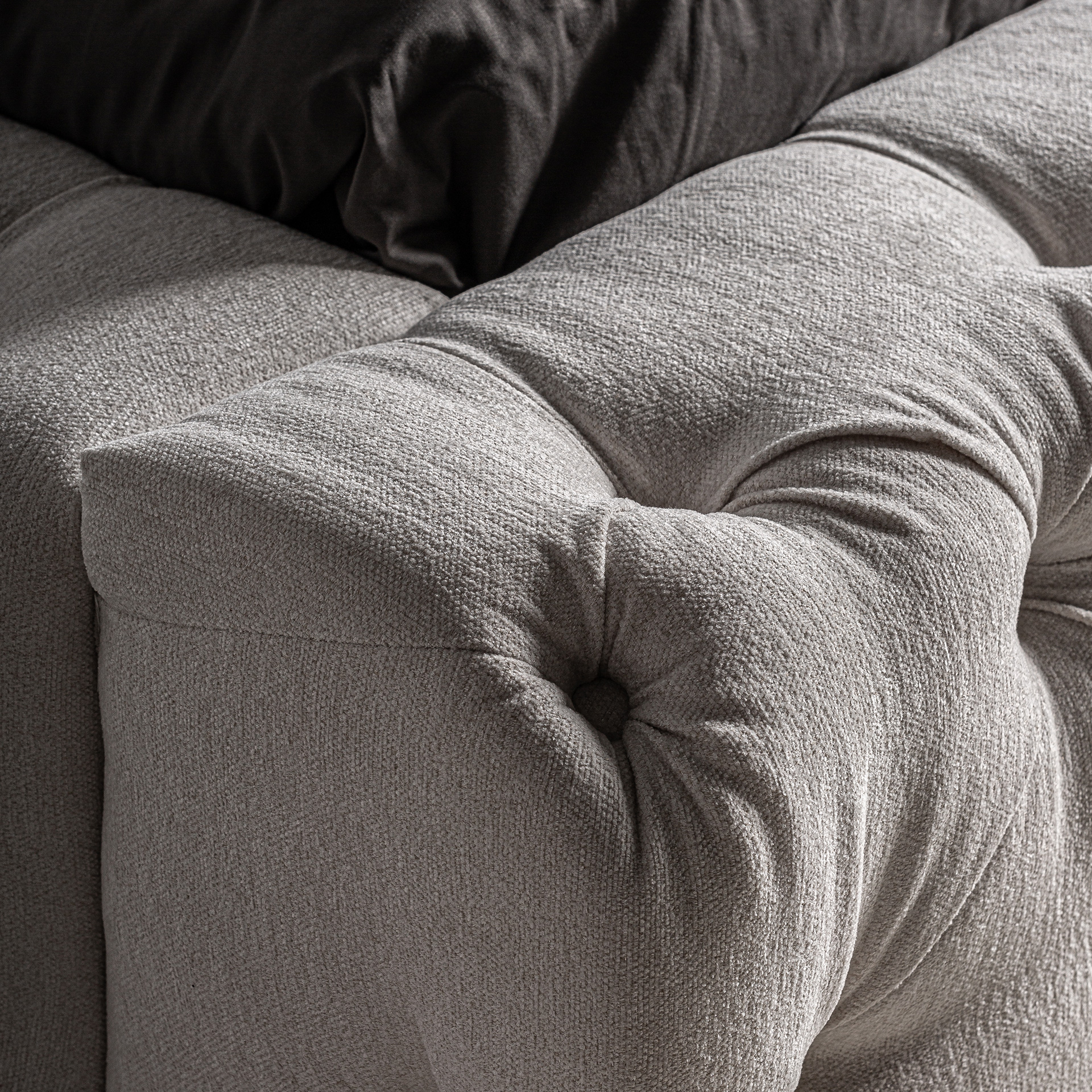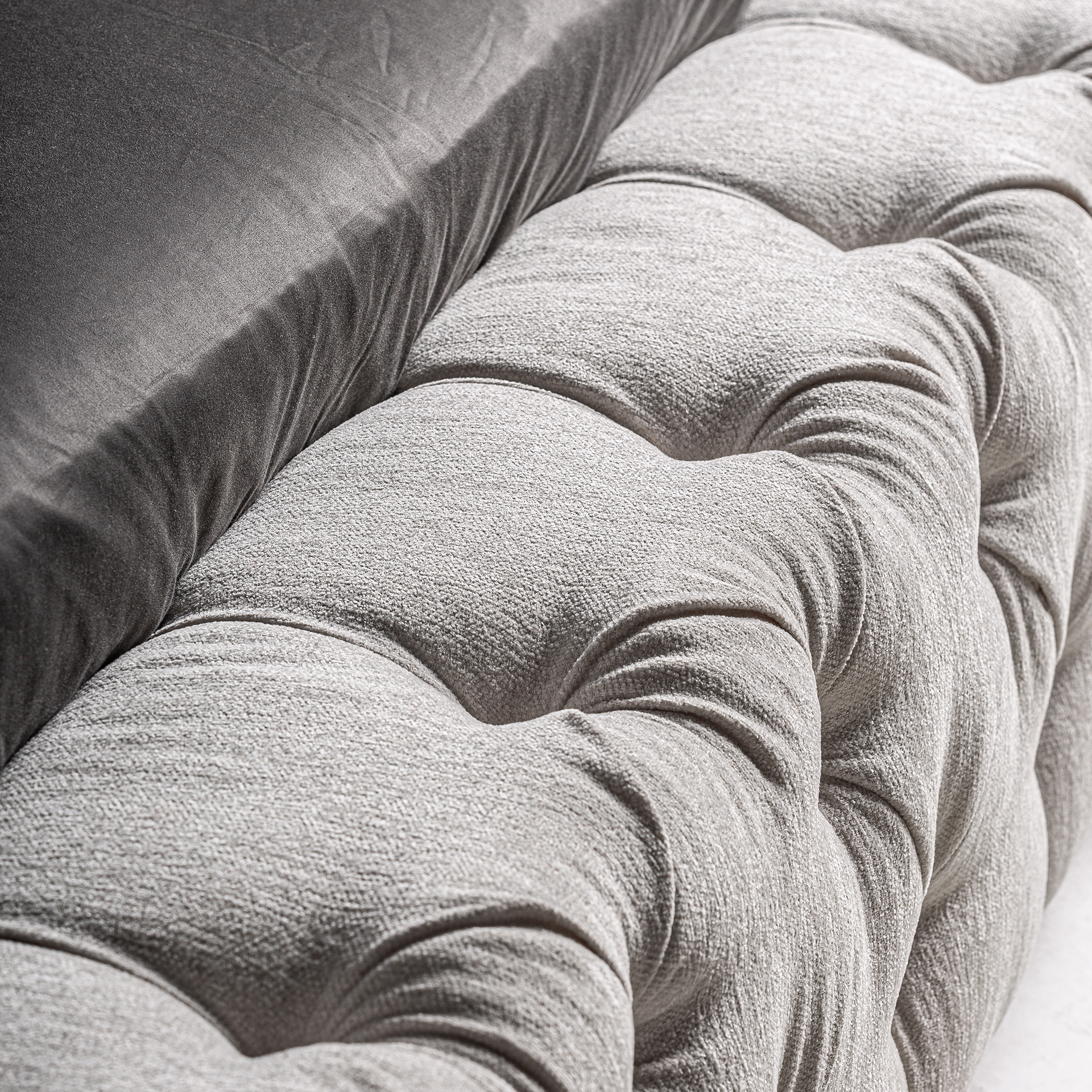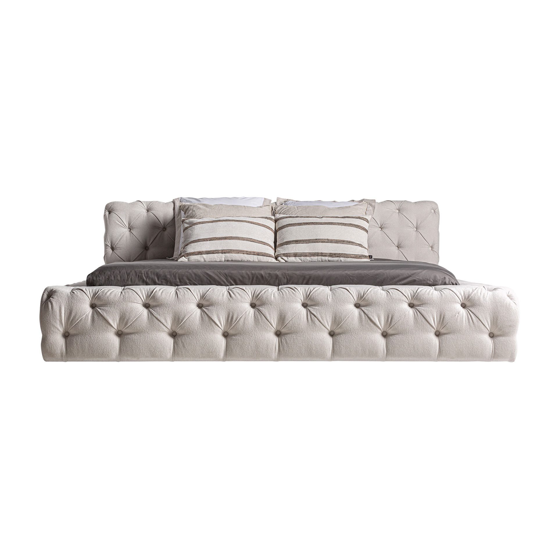 La cama Santorini es un modelo refinado en tono beige claro con un acabado capitoné en cabecera y base, perfecto para quienes buscan un estilo atemporal y acogedor en su espacio de descanso.