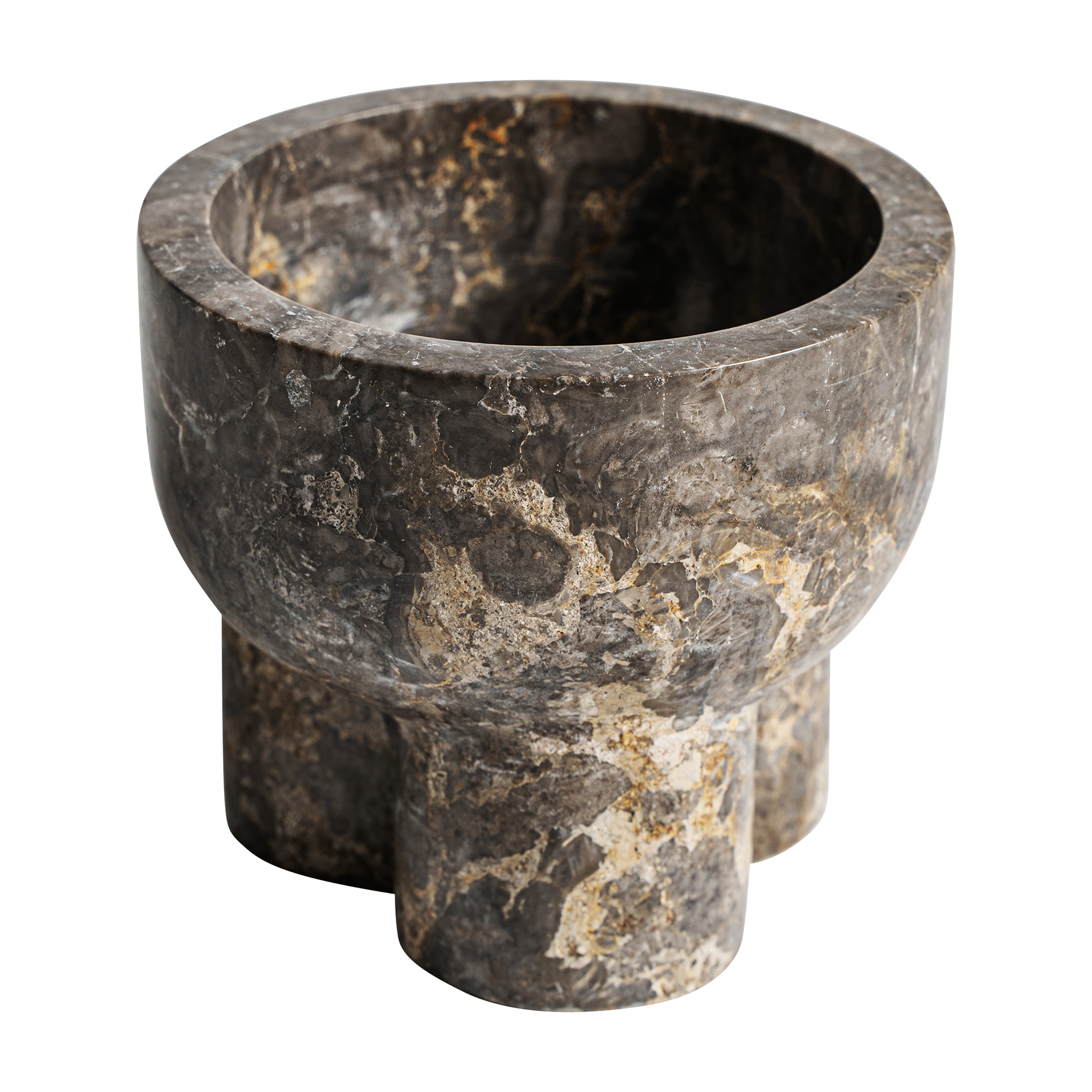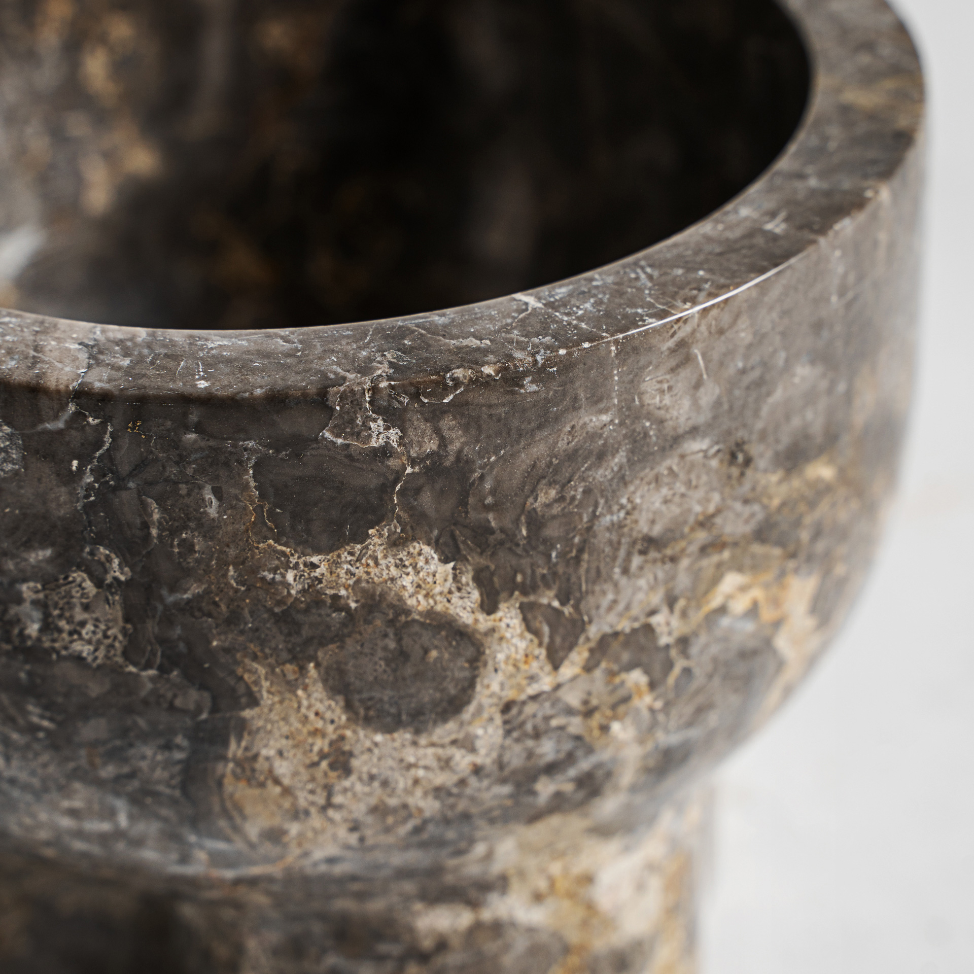 El centro de mesa en mármol oscuro presenta vetas naturales y un acabado pulido que realza su profundidad.