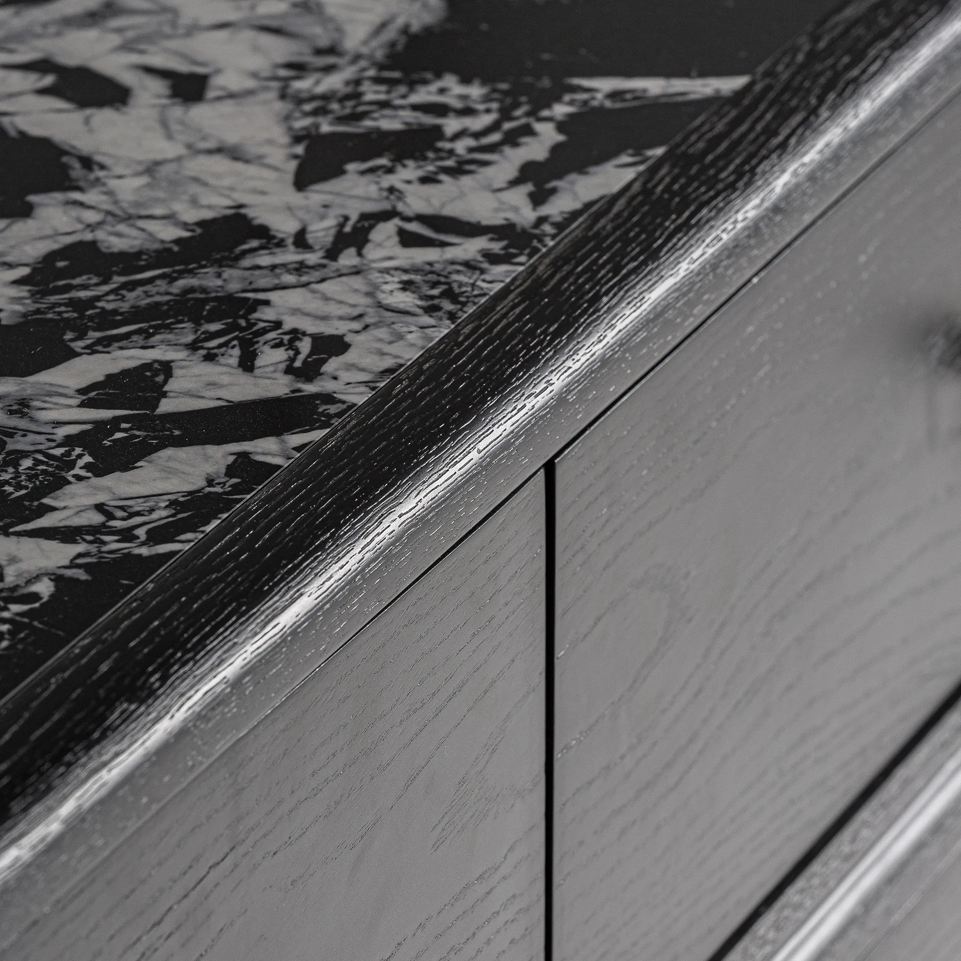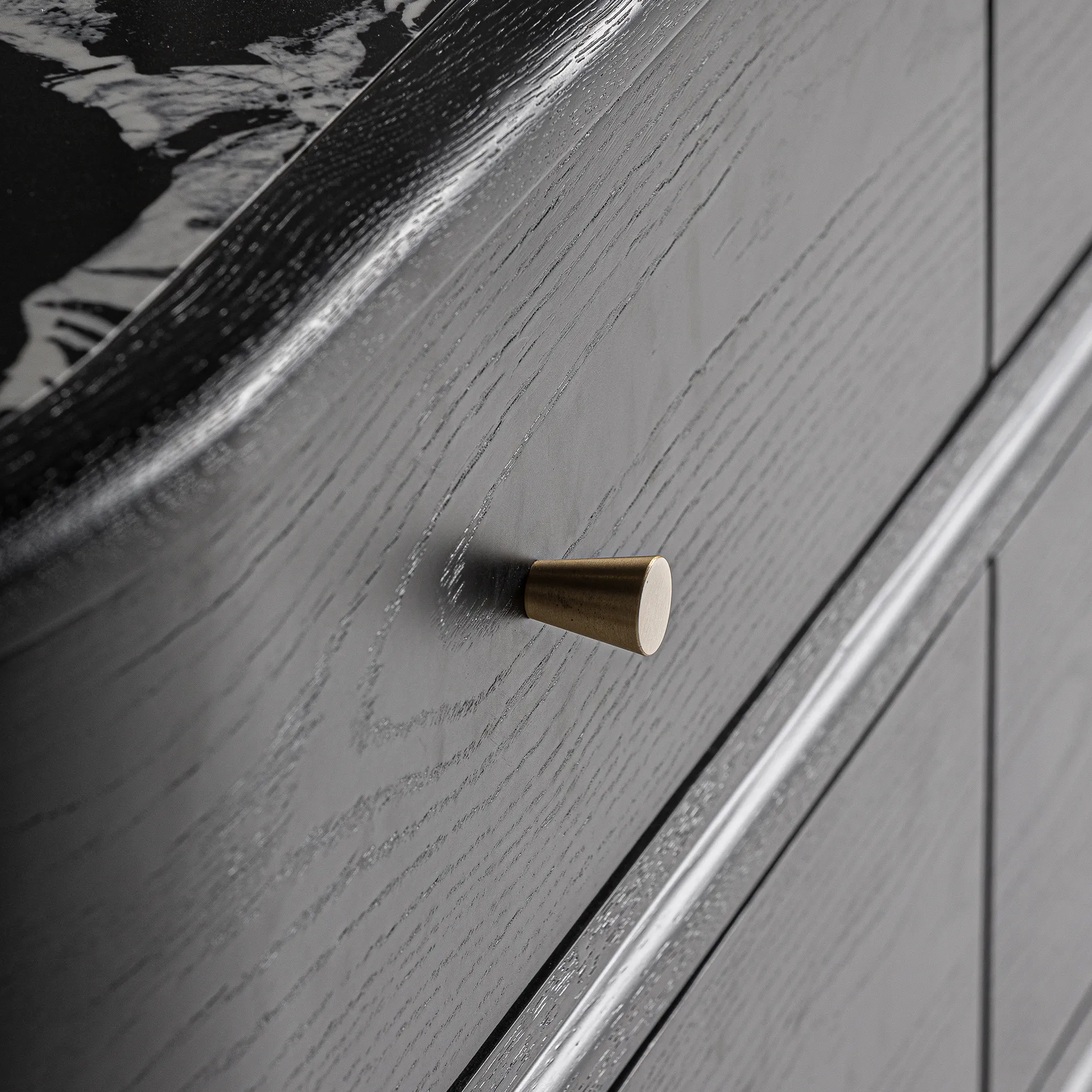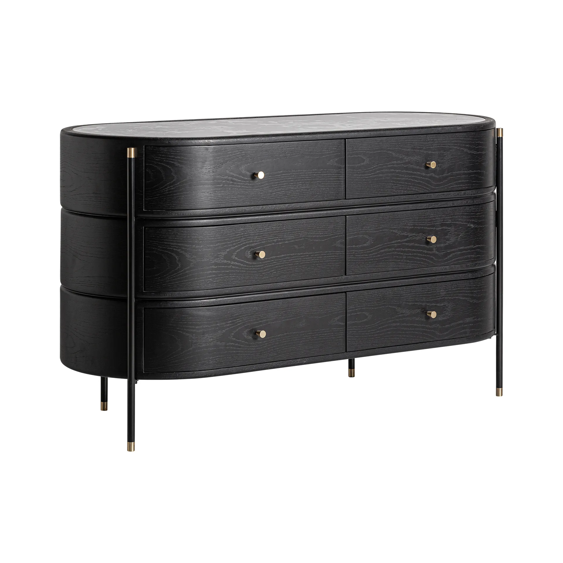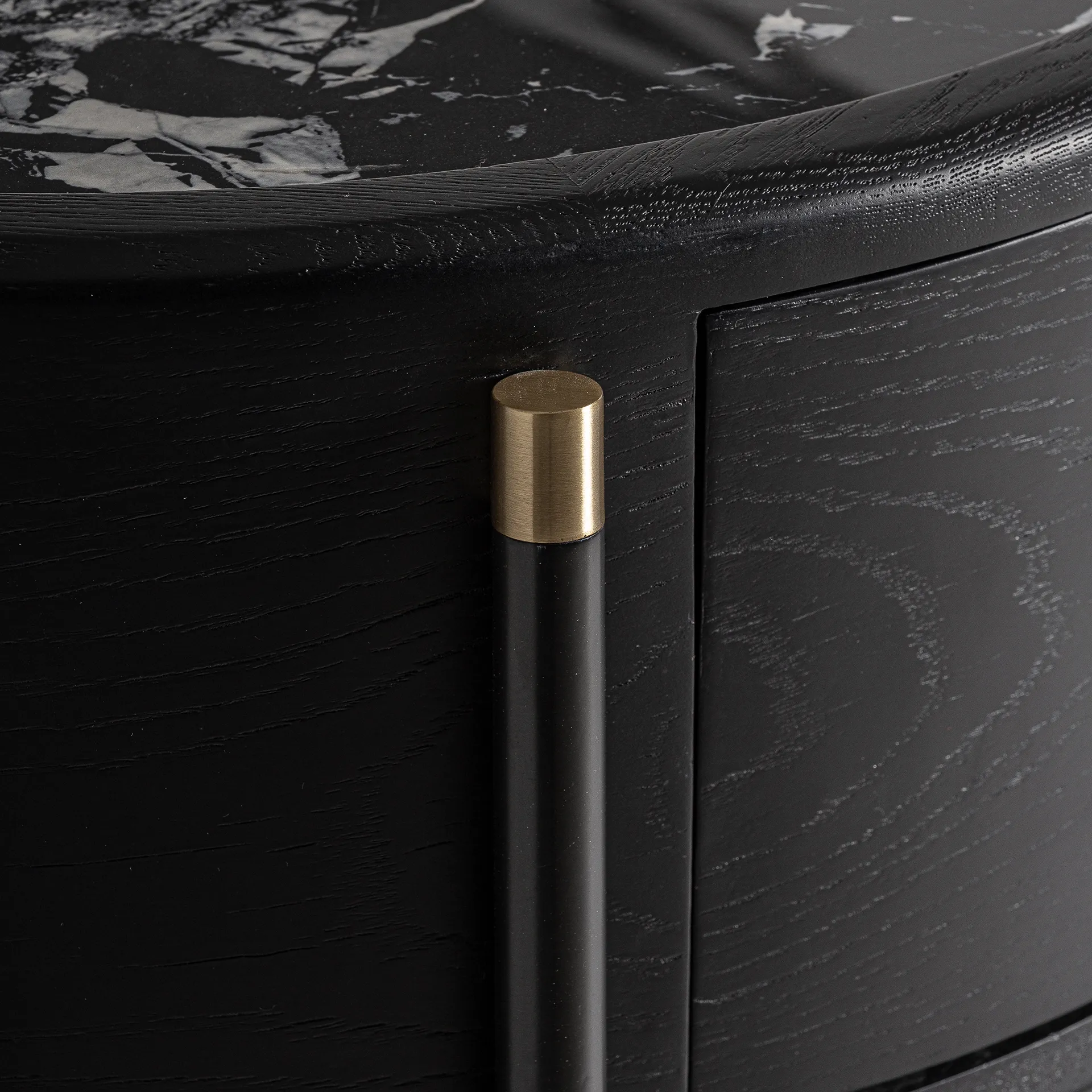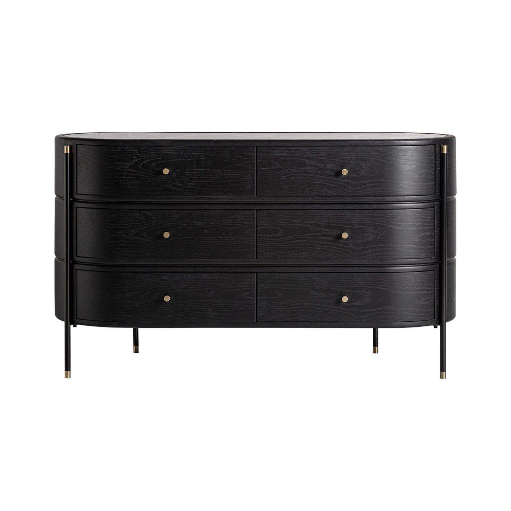 La cómoda Bilzen, con estructura en DM negro y detalles en cerámica estampada, ofrece una estética contemporánea muy sofisticada.