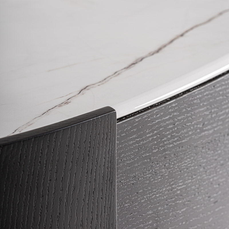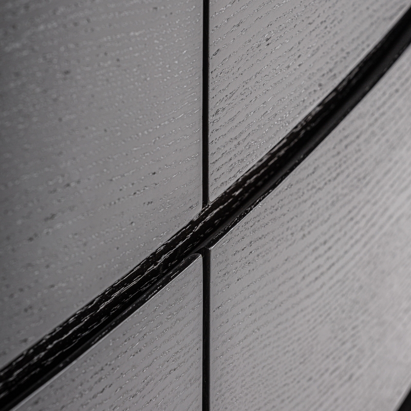 La Cómoda Isola, elaborada en madera contrachapada negra y piedra sinterizada blanca, destaca por su contraste visual y su diseño contemporáneo. Su estructura sobria y su superficie mineral aportan carácter y funcionalidad a cualquier dormitorio.