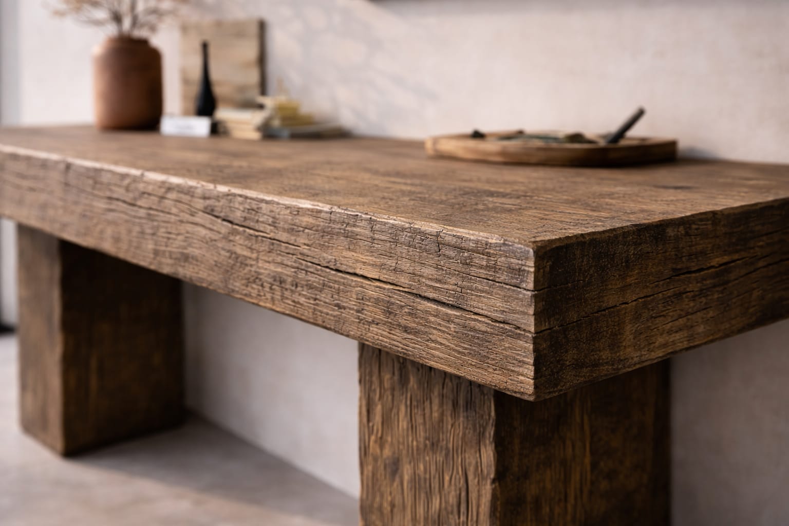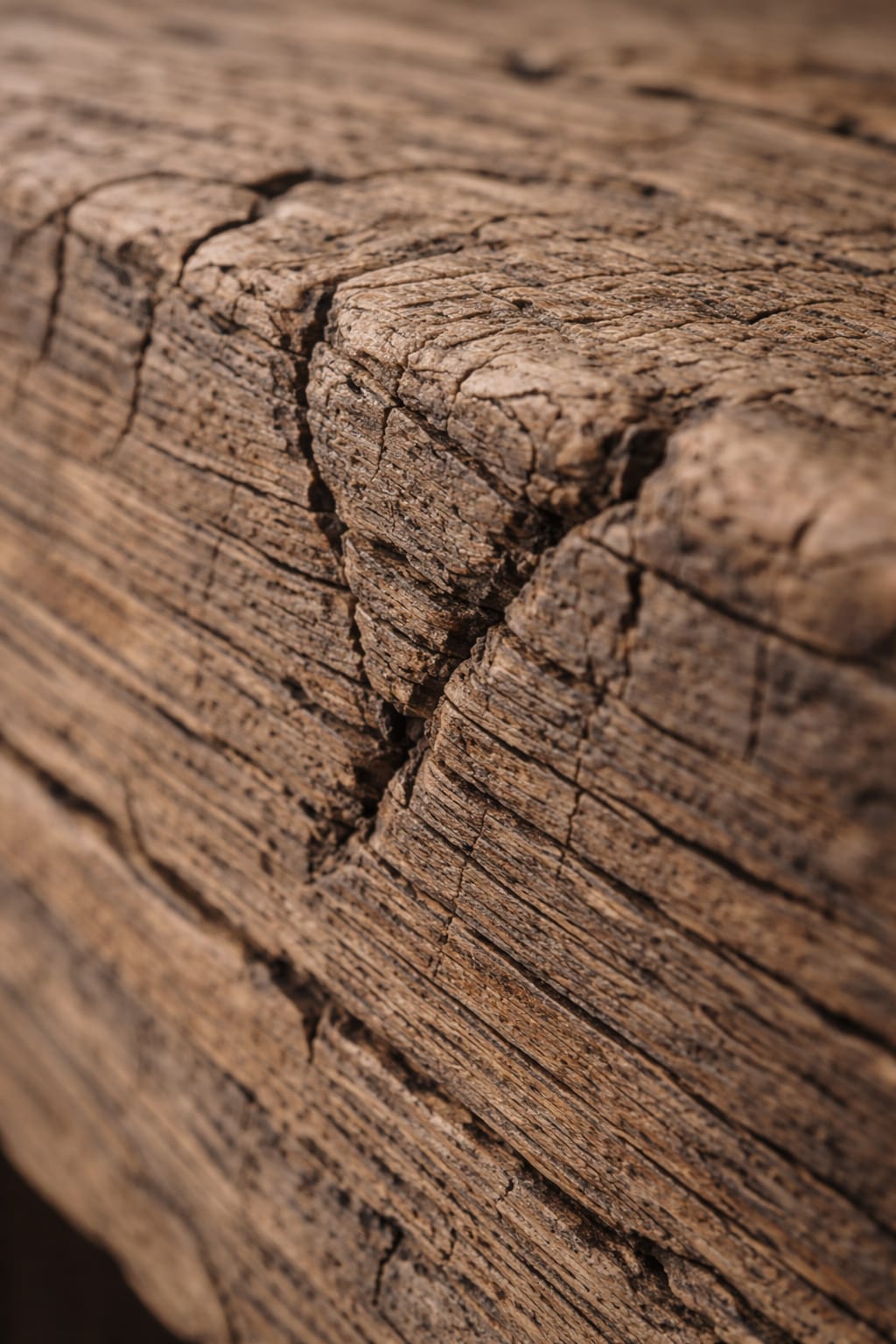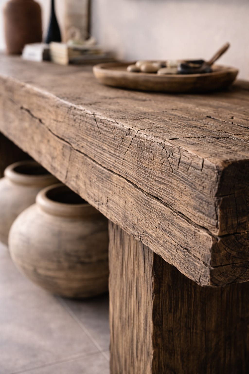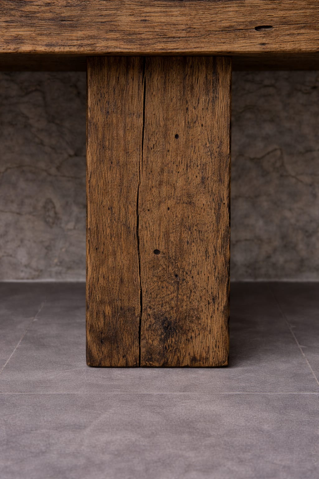 Su tablero de gran grosor, con superficie texturizada y marcada por el paso del tiempo, descansa sobre apoyos macizos que refuerzan su estabilidad y equilibrio visual. Las vetas profundas, grietas naturales y relieves irregulares no se ocultan: se celebran como parte de su autenticidad.
