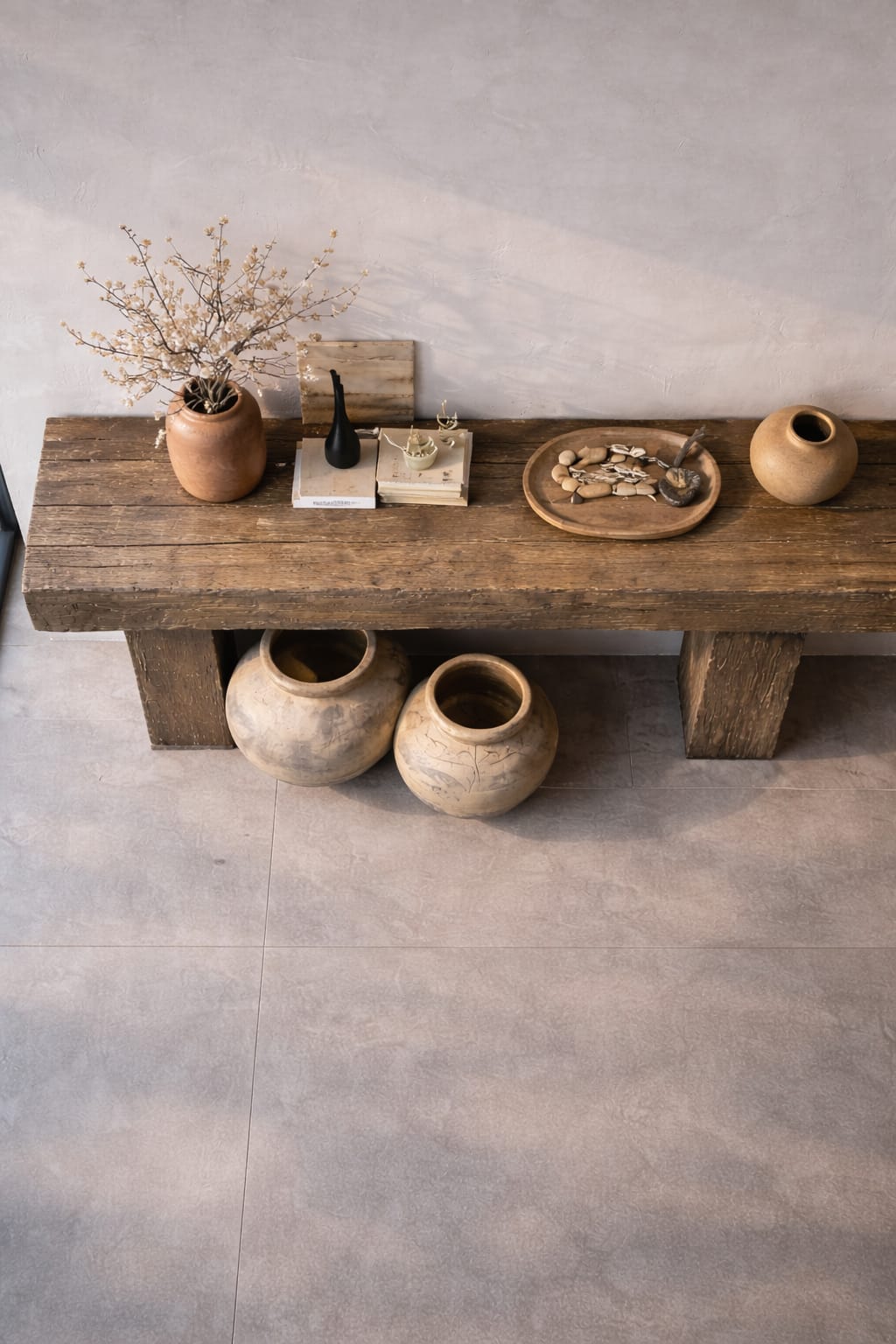 La Consola Meihua está elaborada en madera maciza seleccionada, trabajada manualmente para respetar su textura original. Su acabado realza la profundidad de la veta y aporta una sensación táctil única.