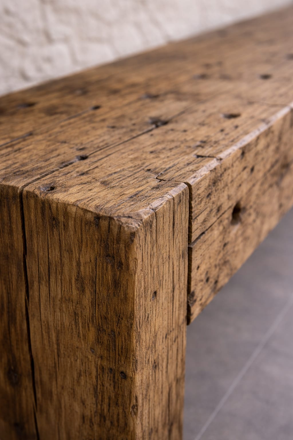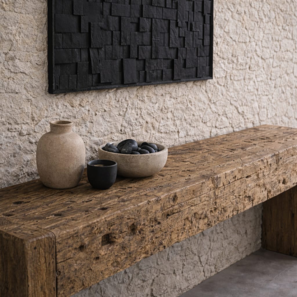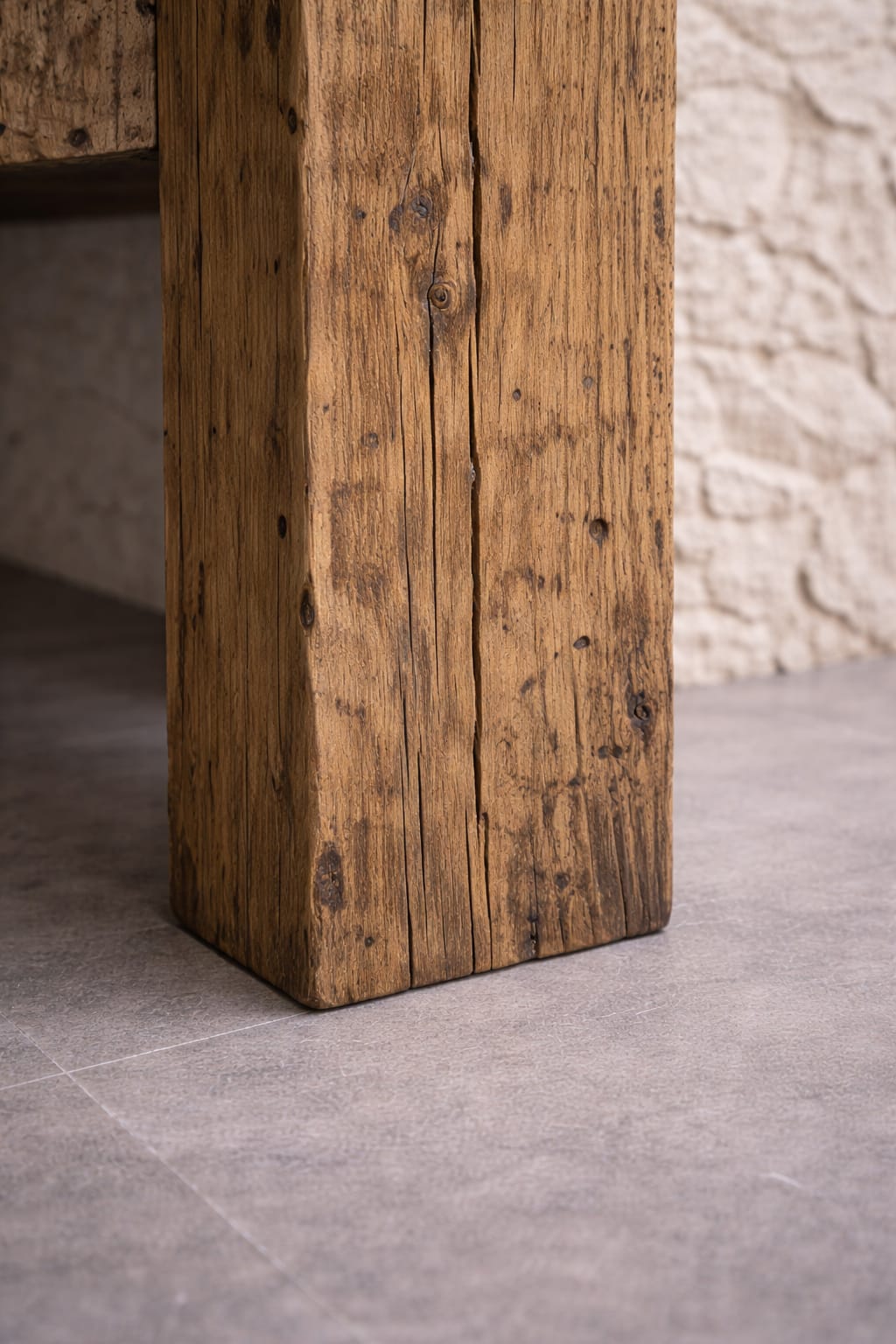 La Consola Yulan está elaborada en madera maciza recuperada, seleccionada por su densidad, resistencia y belleza imperfecta. Cada veta, cada irregularidad y cada variación tonal cuentan una historia.