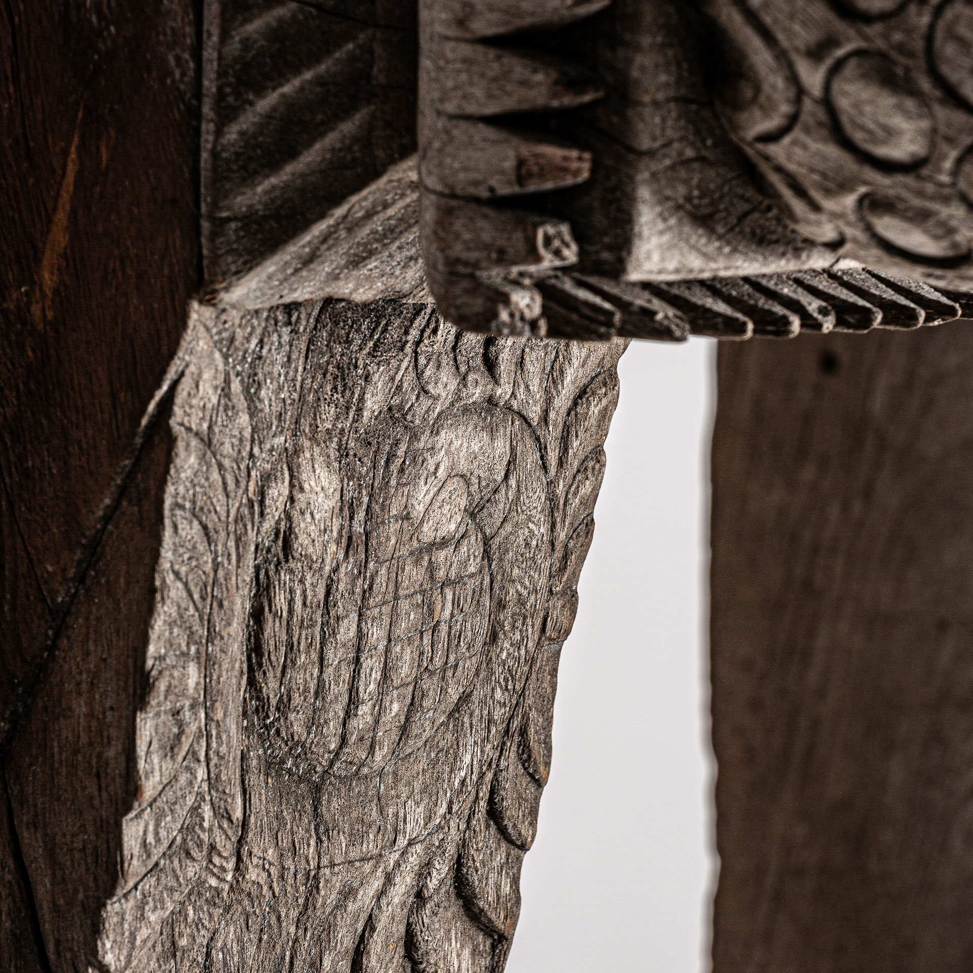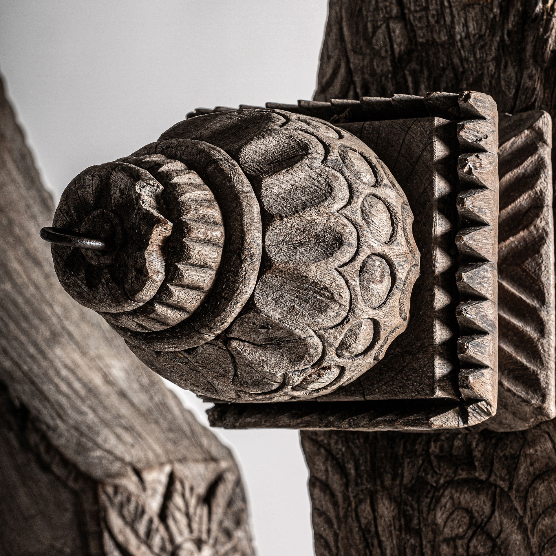 La escultura, en madera tropical marrón envejecida y hierro negro, presenta una estética étnica de gran fuerza visual. Una creación que aporta carácter y autenticidad.