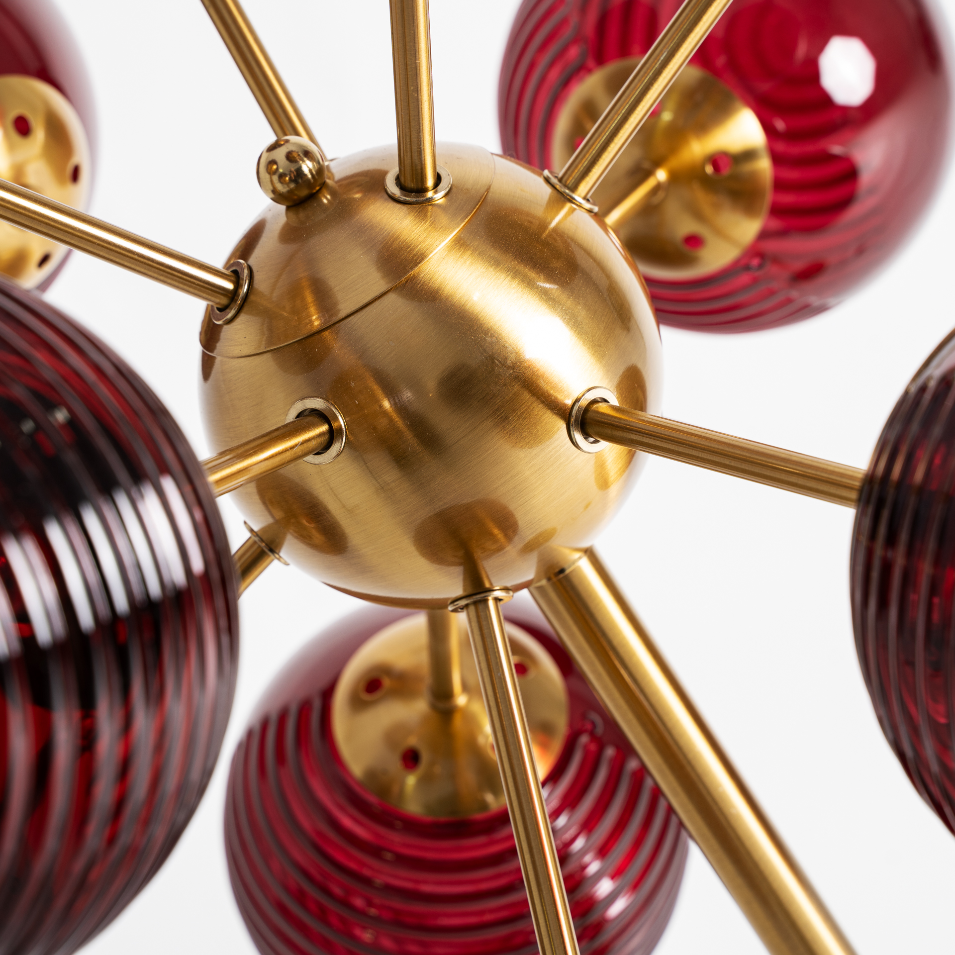 La lámpara de pie Alaia es una pieza decorativa con espíritu escultórico: racimos de cristal burdeos que se elevan sobre una base dorada. Más que iluminar, viste el espacio con una presencia única y sofisticada.