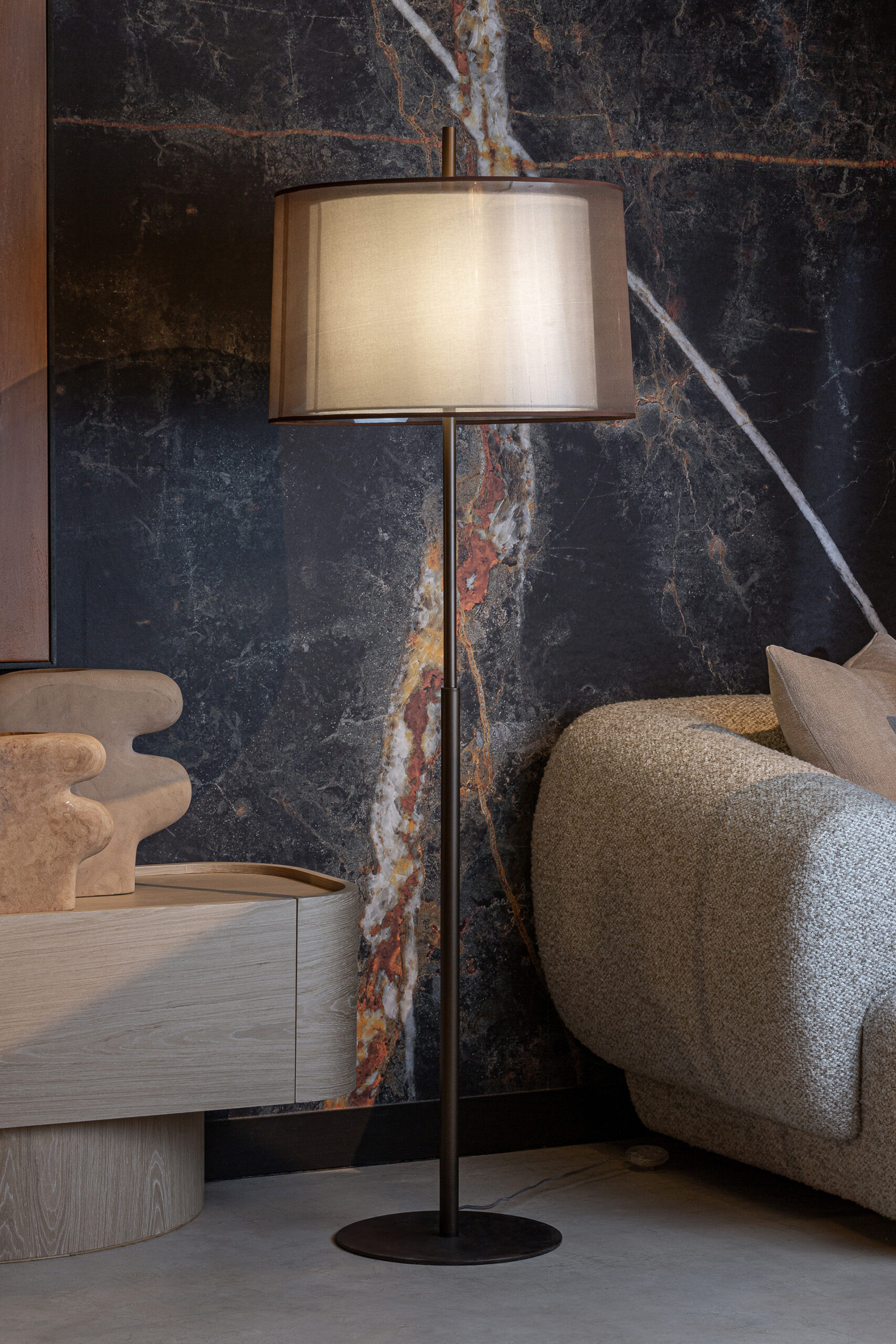 Lámpara de pie Amelie de estilo art deco, fabricado en acero en color negro, combinado con poliéster en color bronce. Producto desmontable.