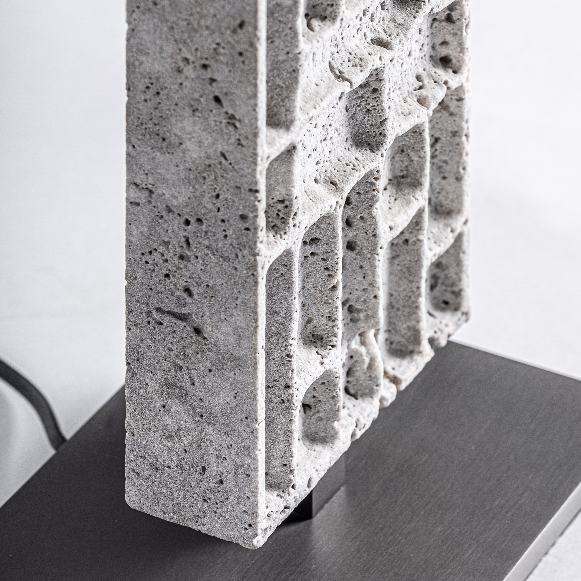 Lámpara de sobremesa Kioni de estilo contemporáneo, fabricado en mármol en color gris, combinado con hierro en color negro y poliéster en color crema. Producto desmontable.