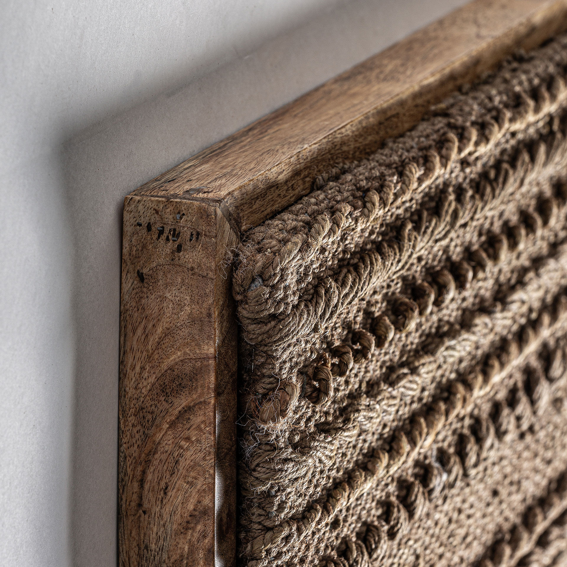 El lienzo, en yute y madera DM, presenta una estética rústica y sobria. Una pieza de VICAL con presencia y equilibrio.