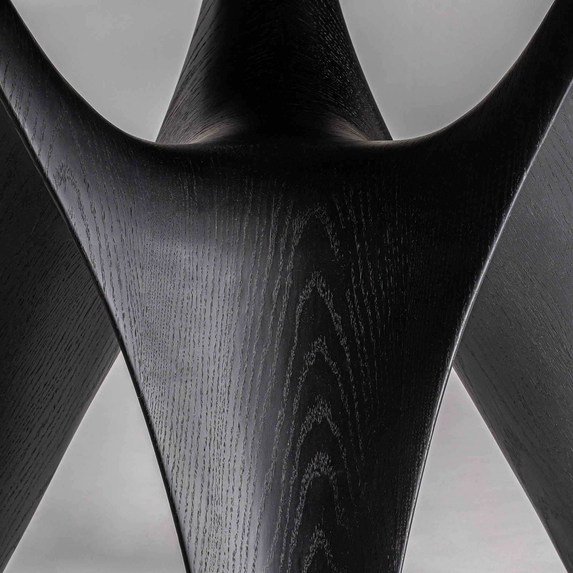 La mesa Bilzen está fabricada en chapa de roble negro, y combina con madera DM y fibra de vidrio para crear una base imponente y sofisticada.