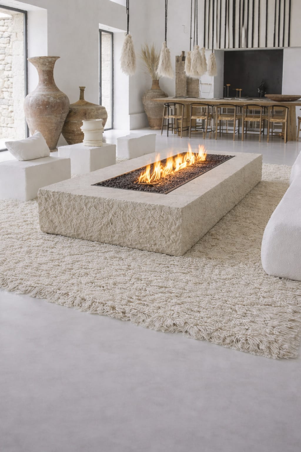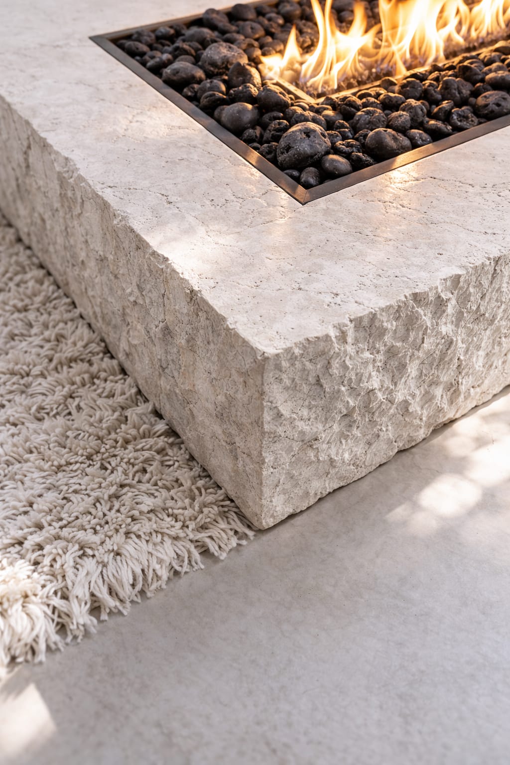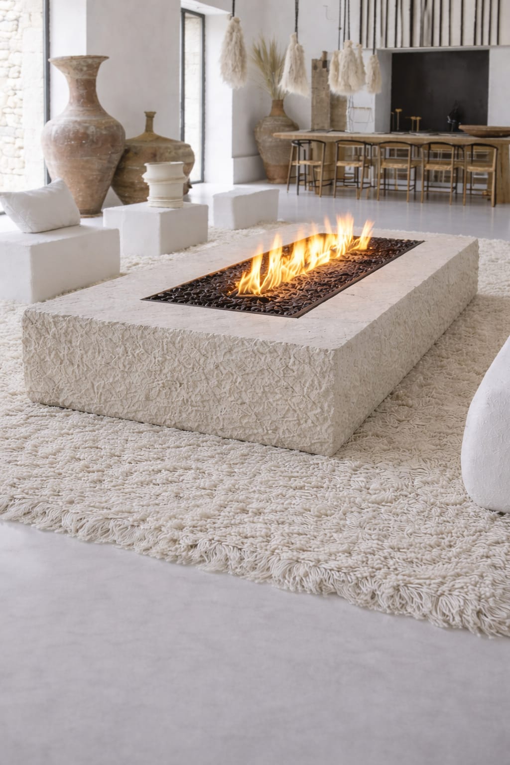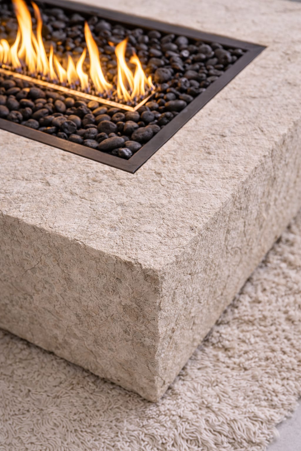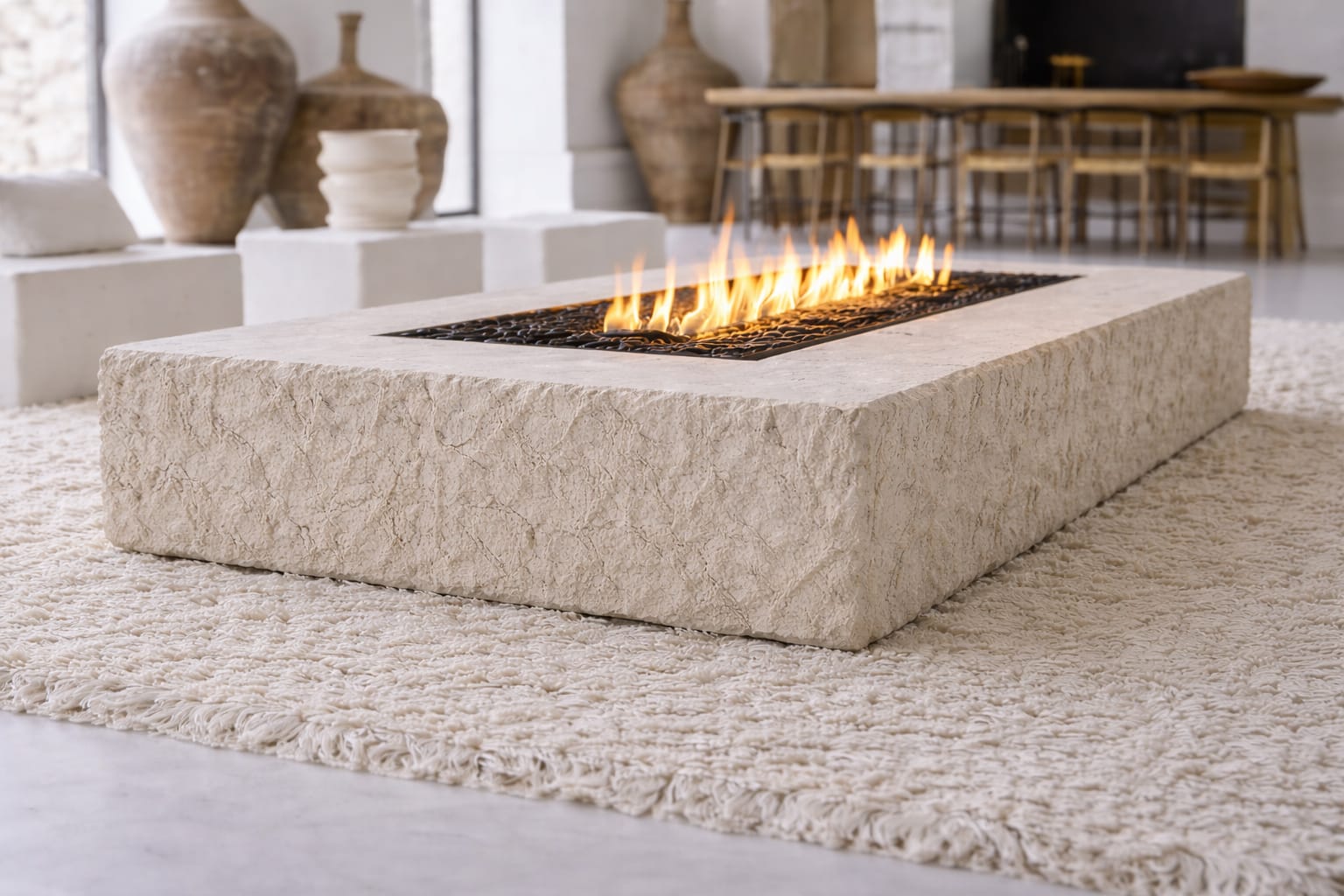 Su volumen sólido y textura tallada aportan carácter arquitectónico, mientras que la integración de fuego central la transforma en una pieza sensorial que combina diseño, materia y calidez.
