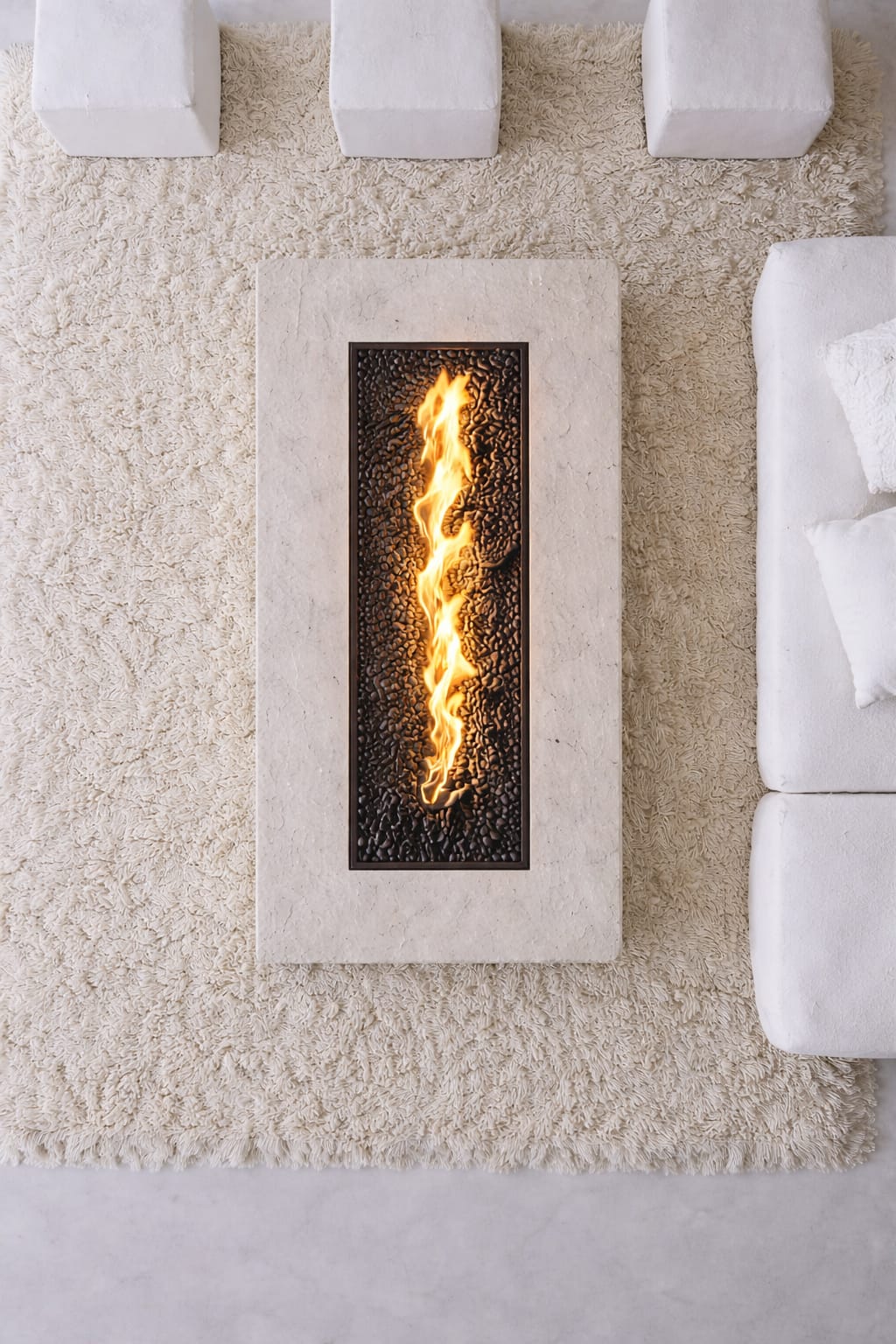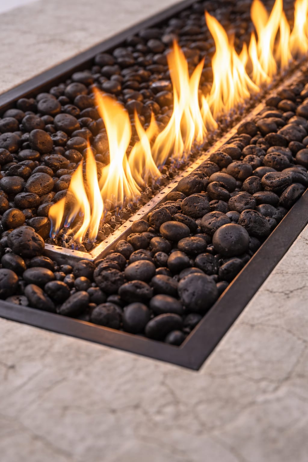 El quemador lineal central aporta un efecto visual sofisticado y una atmósfera envolvente, creando un equilibrio perfecto entre solidez mineral y movimiento del fuego.