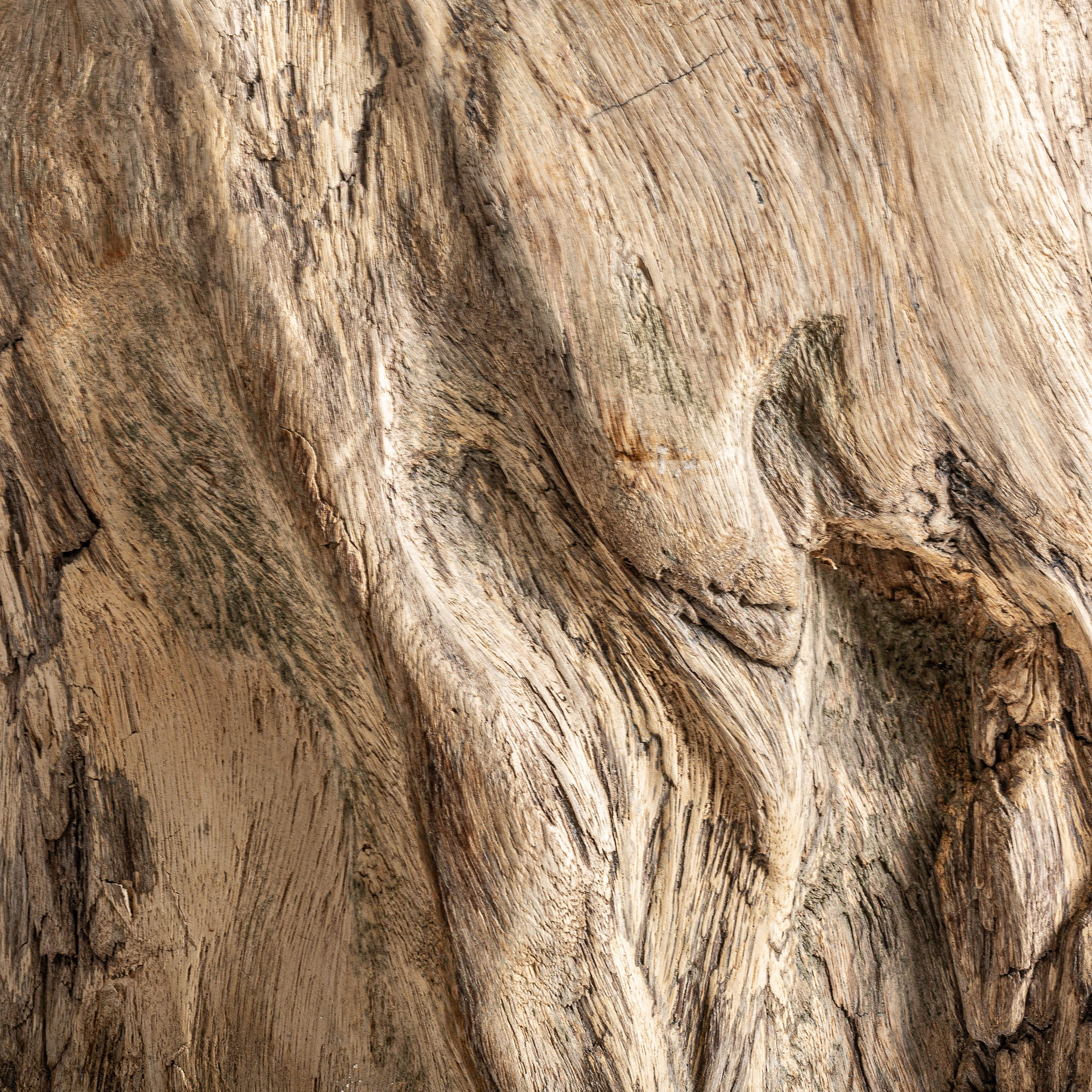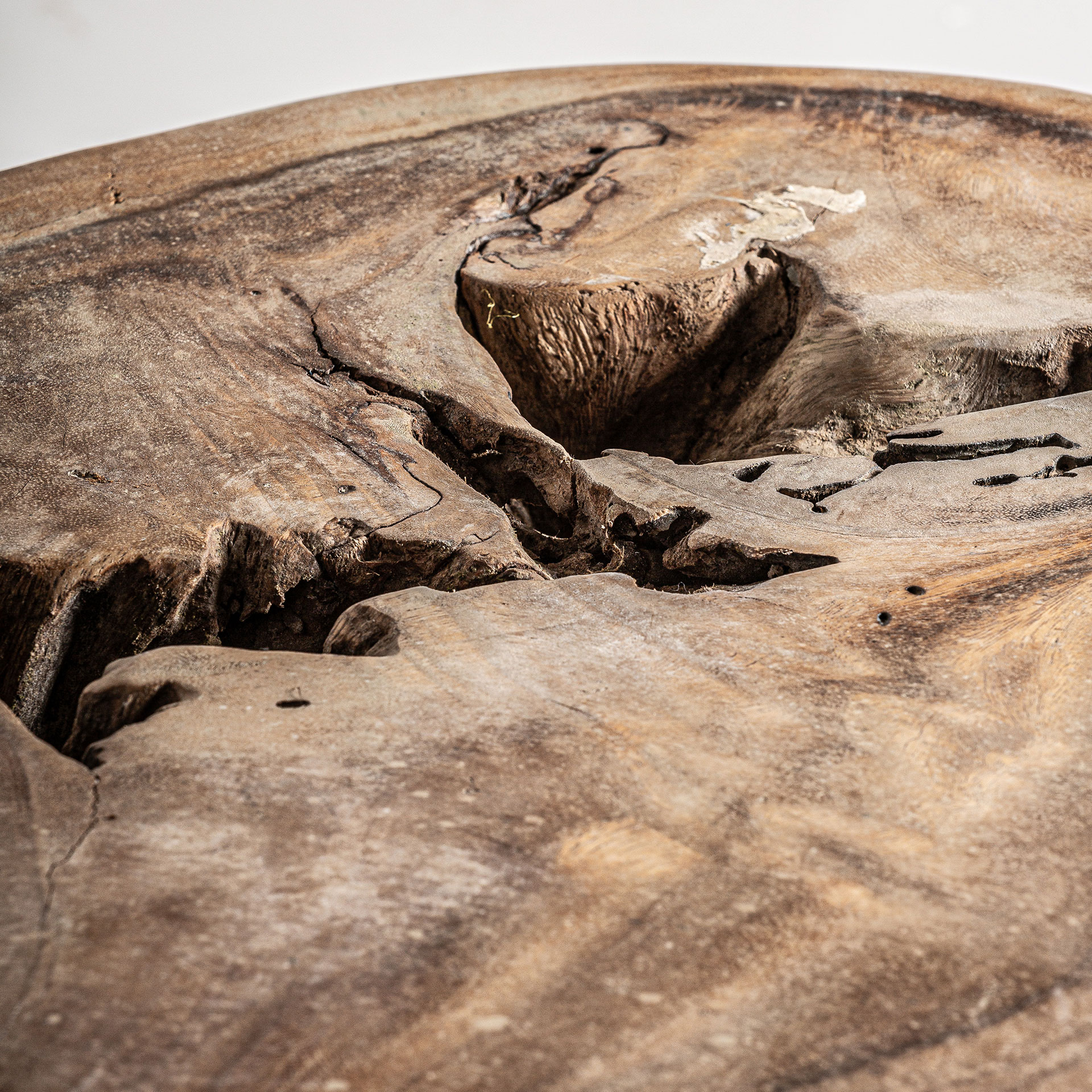 La mesa de centro KHALED, fabricada en madera de suar con acabado natural, es una pieza escultural que conecta con la esencia de la tierra.