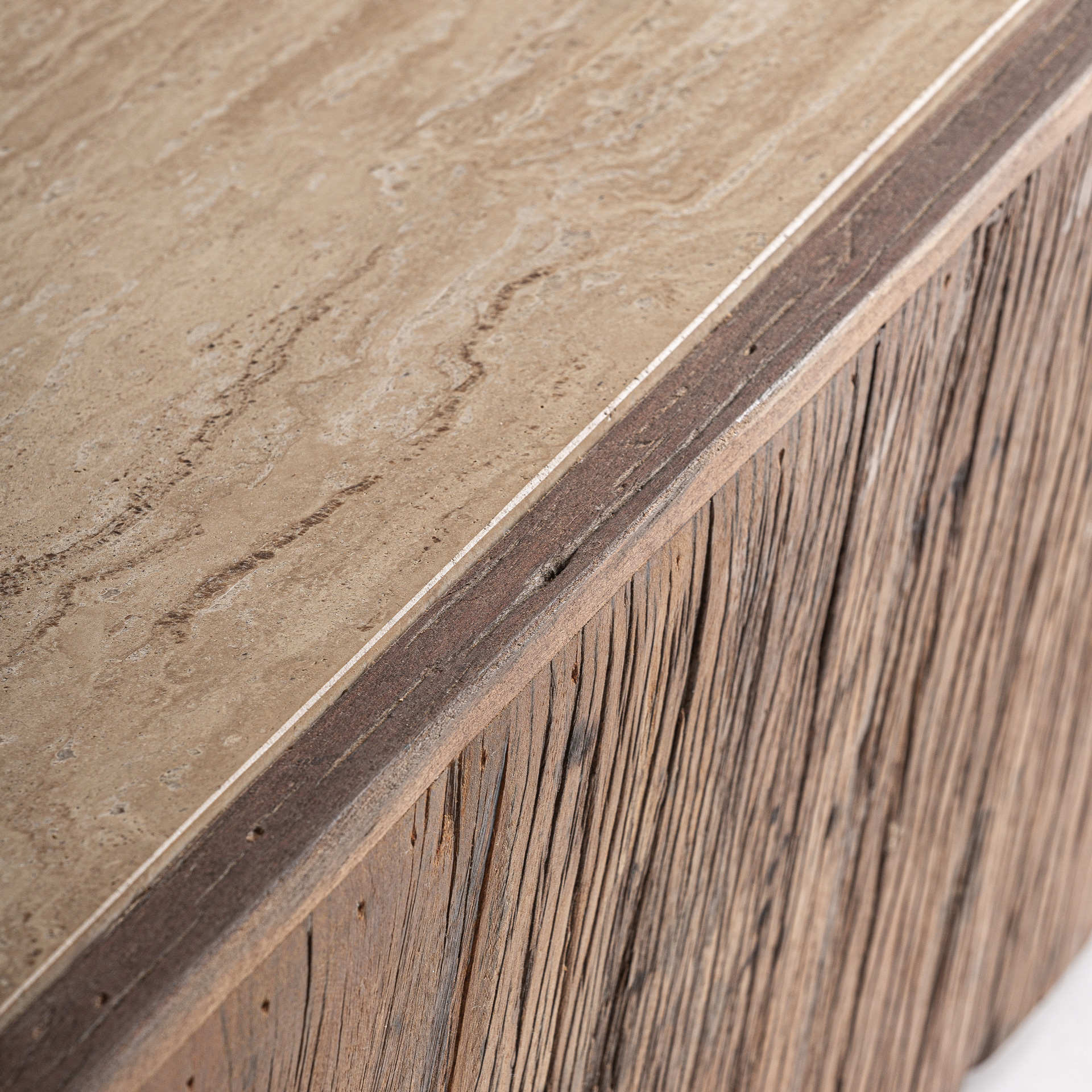 La Mesa de Centro Merkem combina solidez y elegancia a través de un diseño rotundo y atemporal. La madera recuperada en tono marrón envejecido dialoga con el travertino beige satinado, generando un contraste natural y sofisticado. Pensada para espacios residenciales y contract que buscan piezas con identidad, textura y una fuerte presencia material.
