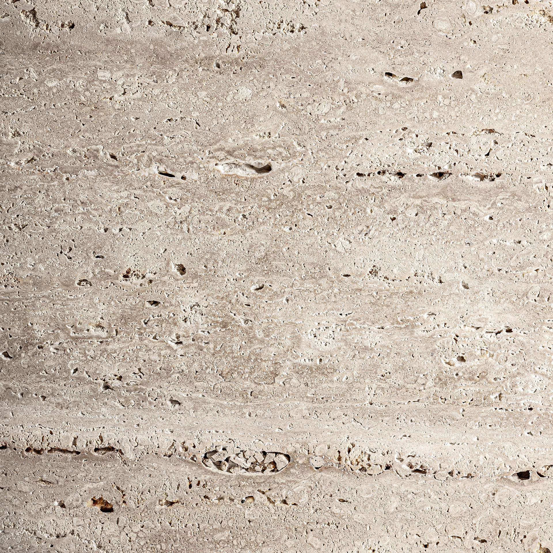 Elaborada en travertino beige, su diseño minimalista con influencias art déco realza cualquier espacio con su textura natural preciosa para decorar cualquier estancia.