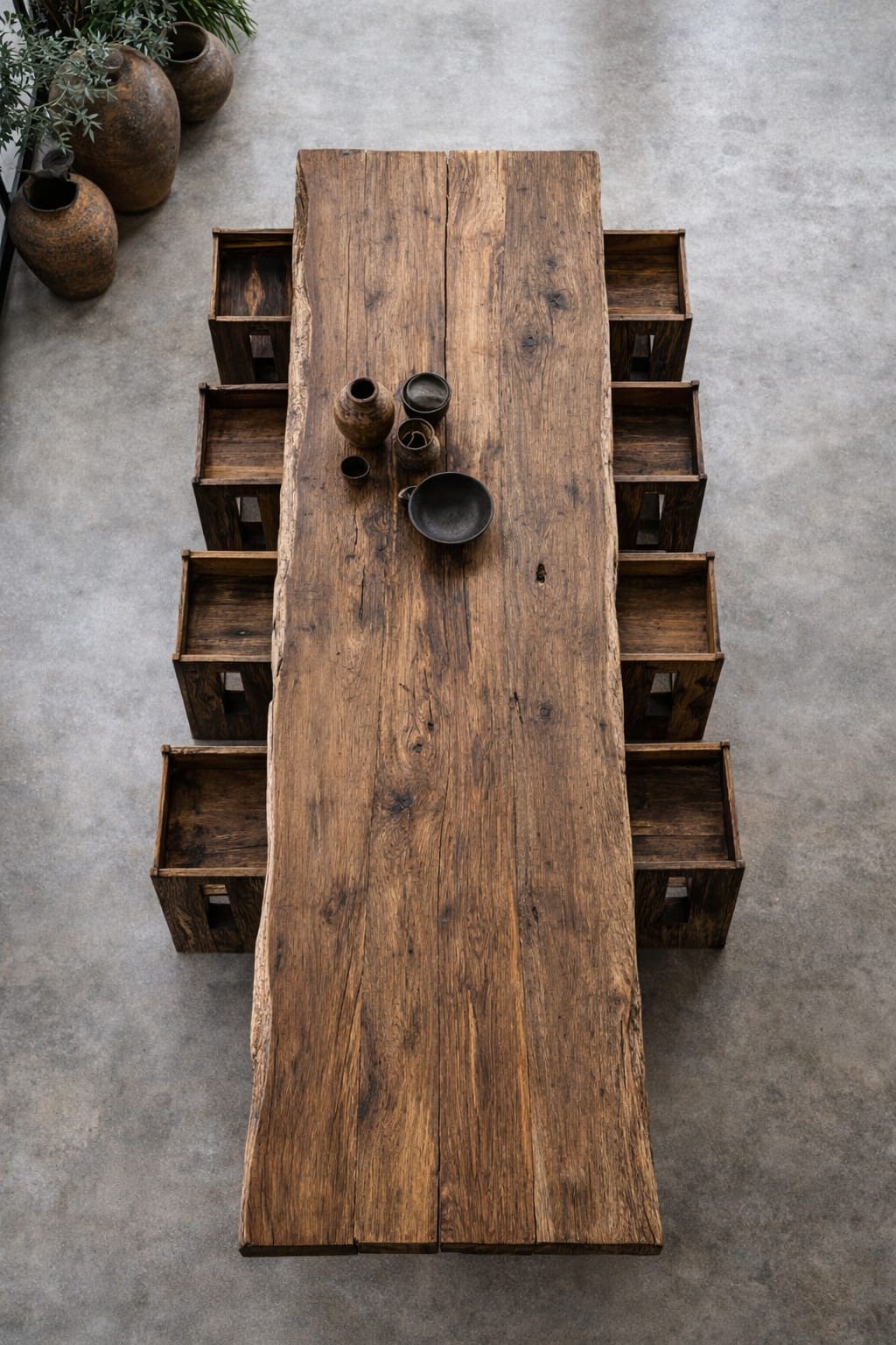 Cada pieza se fabrica bajo pedido en nuestro taller, respetando la forma, el ritmo y las singularidades propias de la madera. Nudos, vetas, ligeras grietas o variaciones de color no se ocultan: se celebran como parte de la identidad de una mesa irrepetible, pensada para durar generaciones.