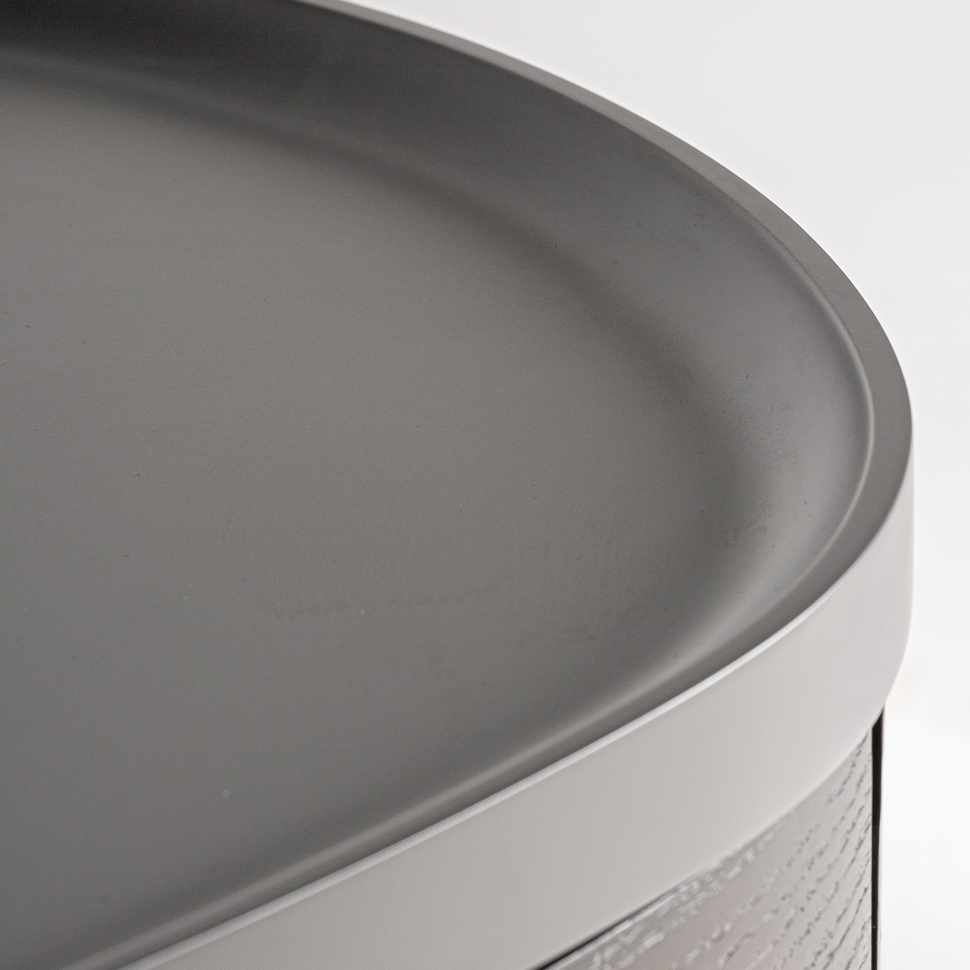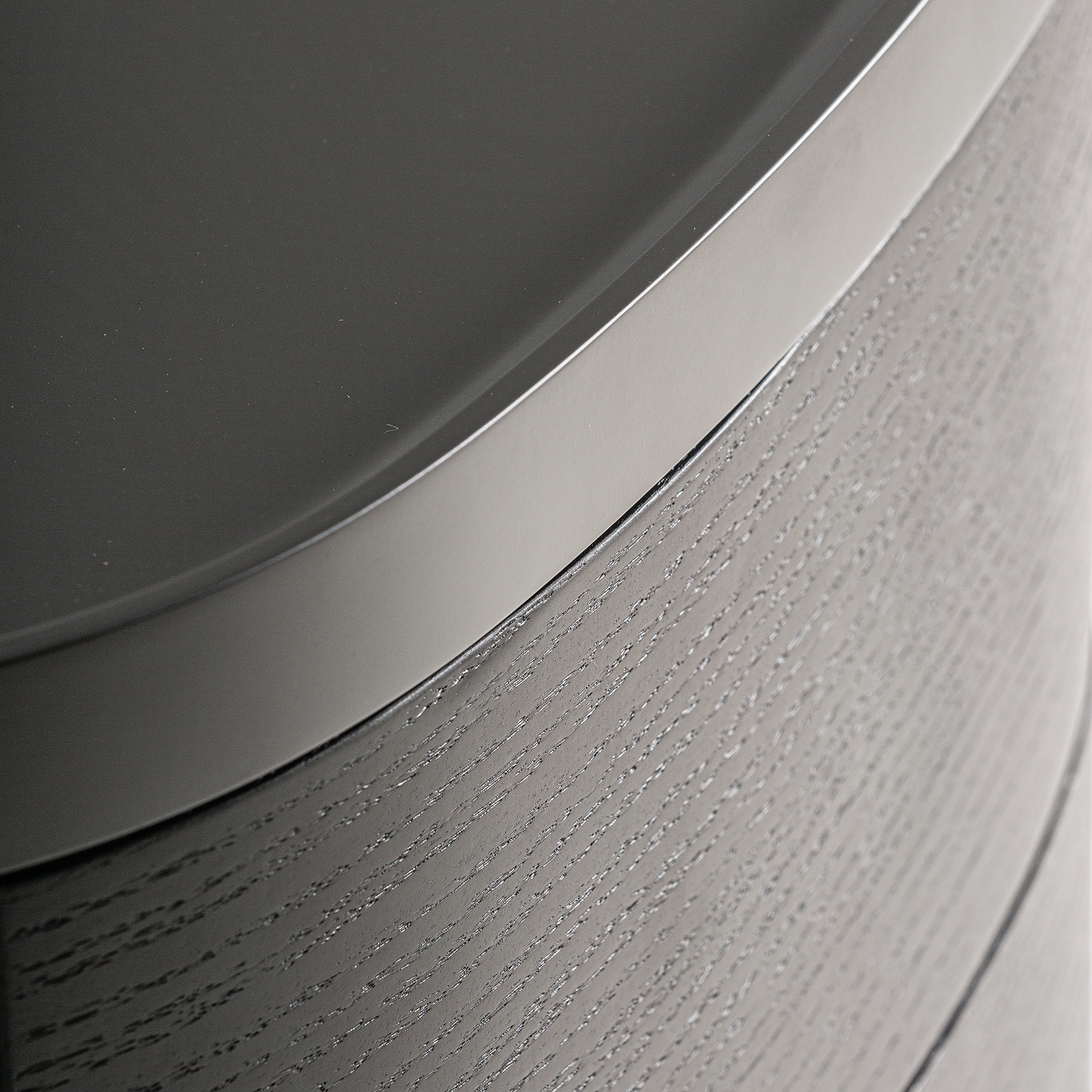 Mesita de noche liestal de estilo art deco, fabricado en madera dm en color negra, combinado con chapa de roble en color gris.