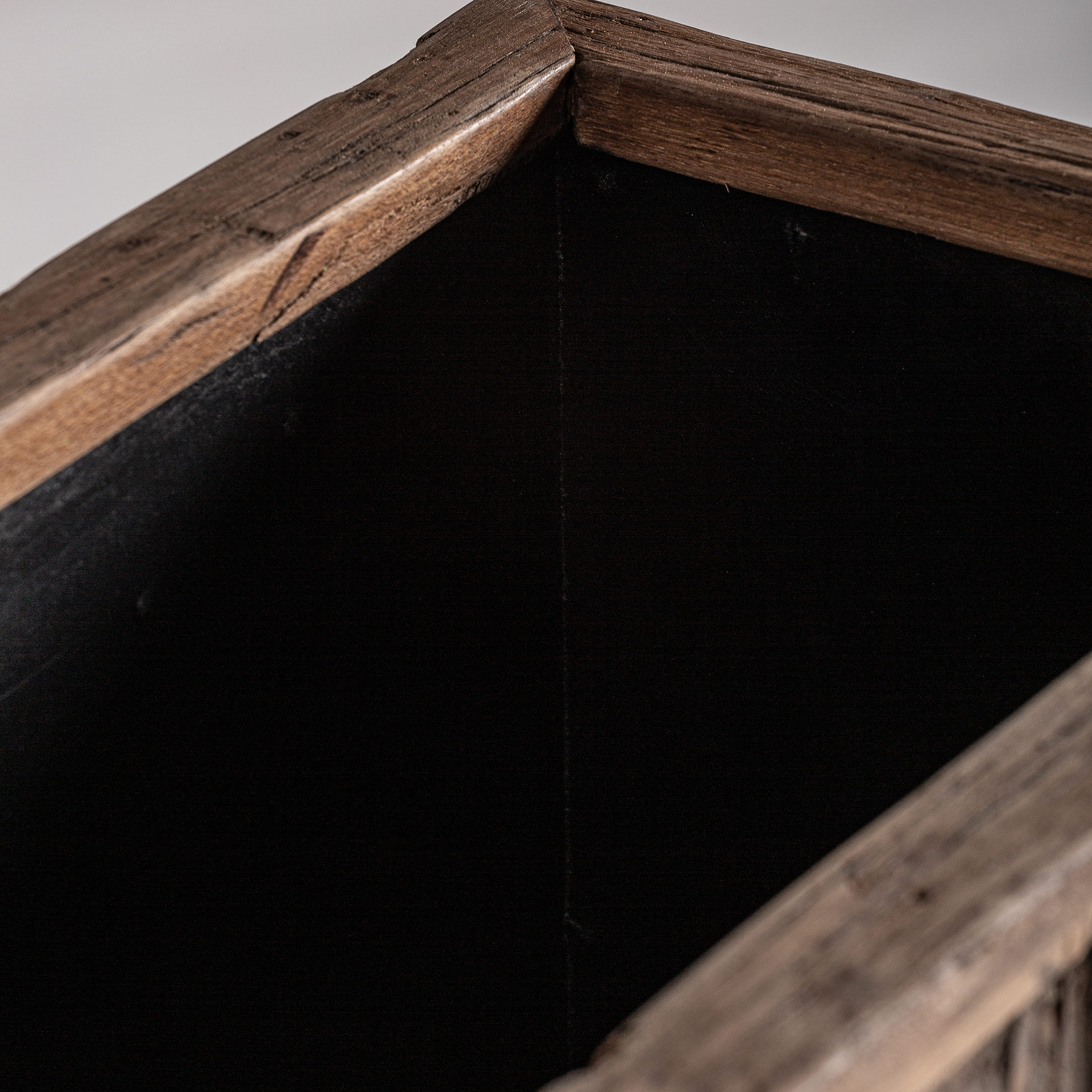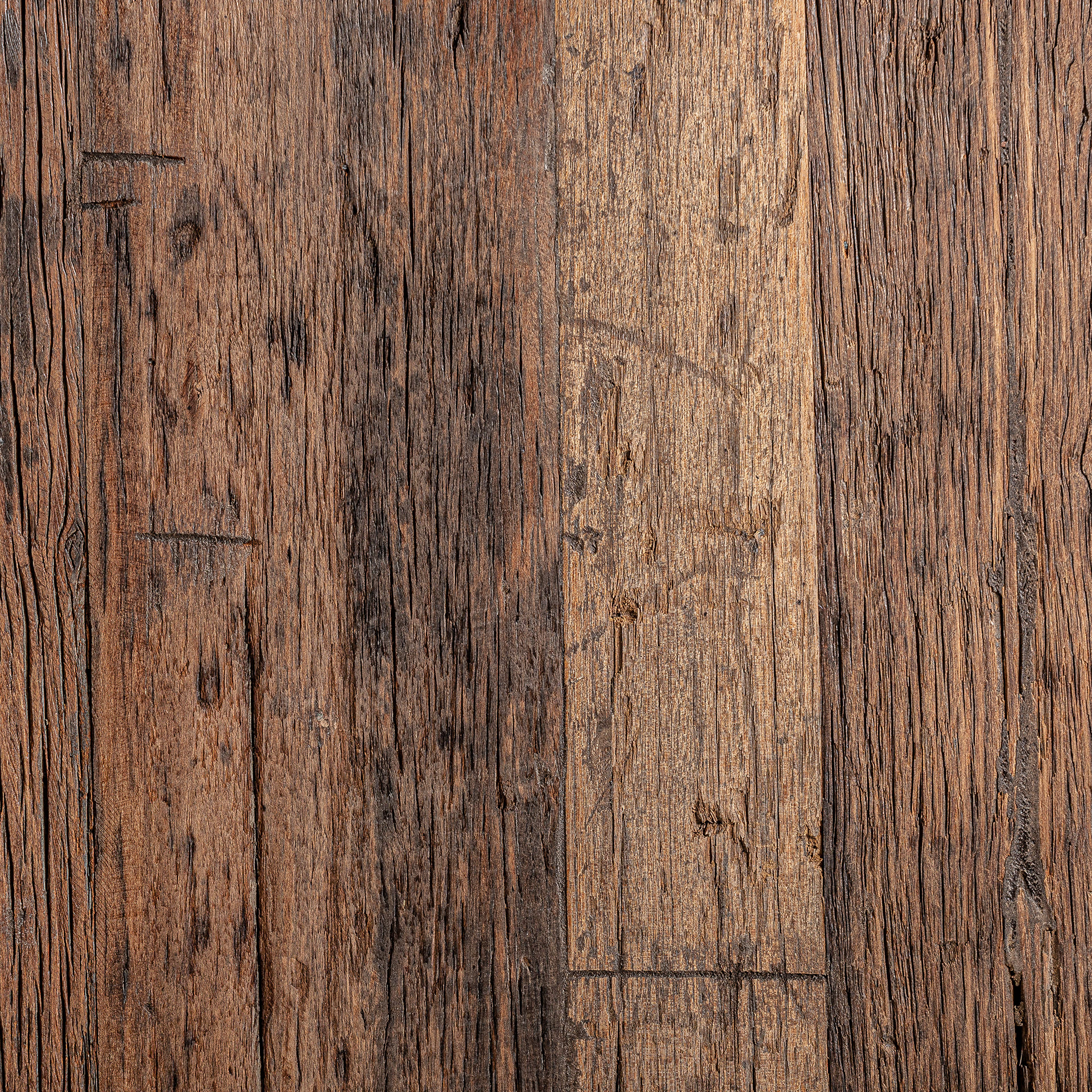 Frontal protagonista. Este módulo ancho en madera recuperada marrón, con vetas marcadas y tonos naturales, sirve como base visual de cualquier barra.