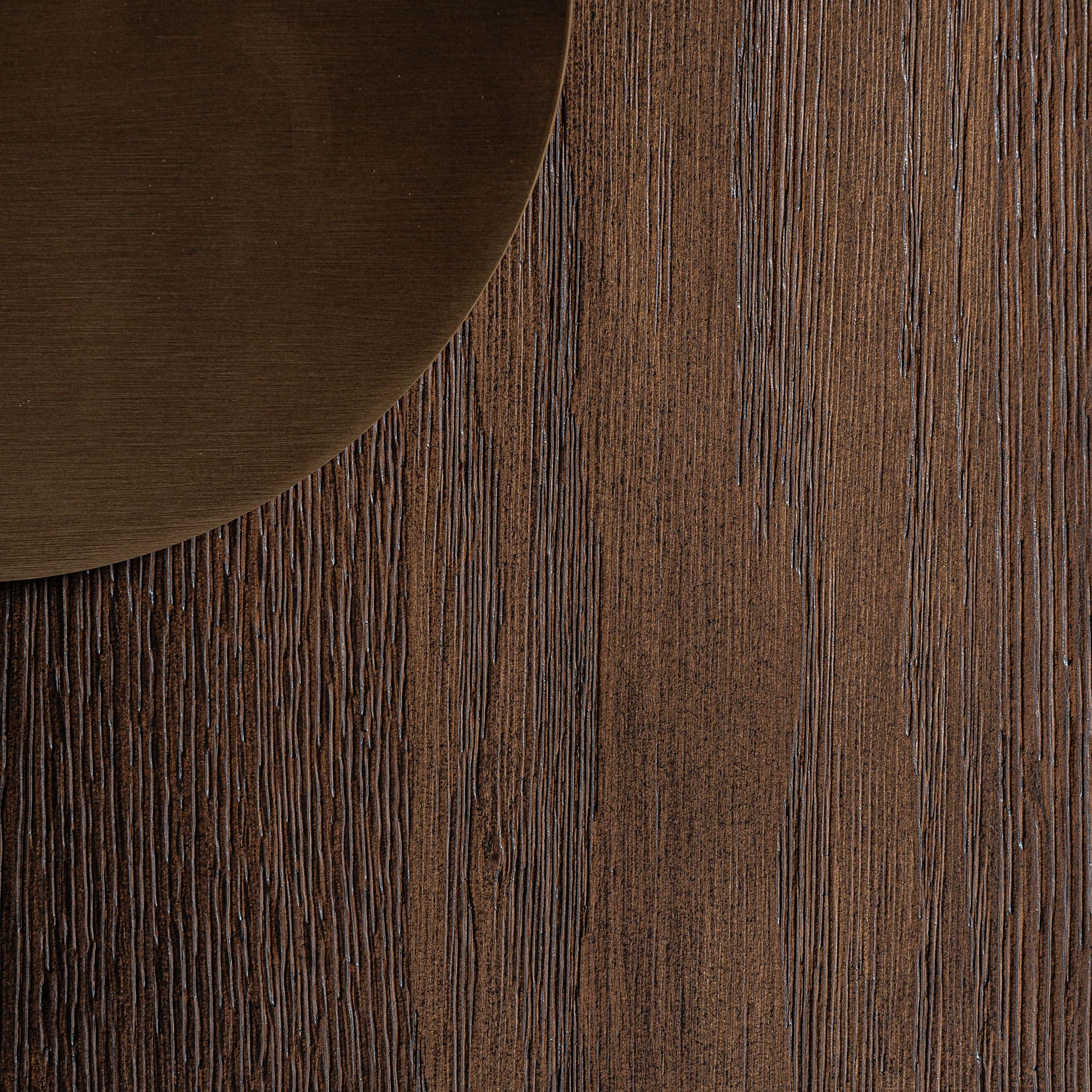 Mueble tv treignac de estilo art deco, fabricado en madera roble en color marrón con acabado teñido, combinado con bronce en color bronce con acabado mate. Producto desmontable.