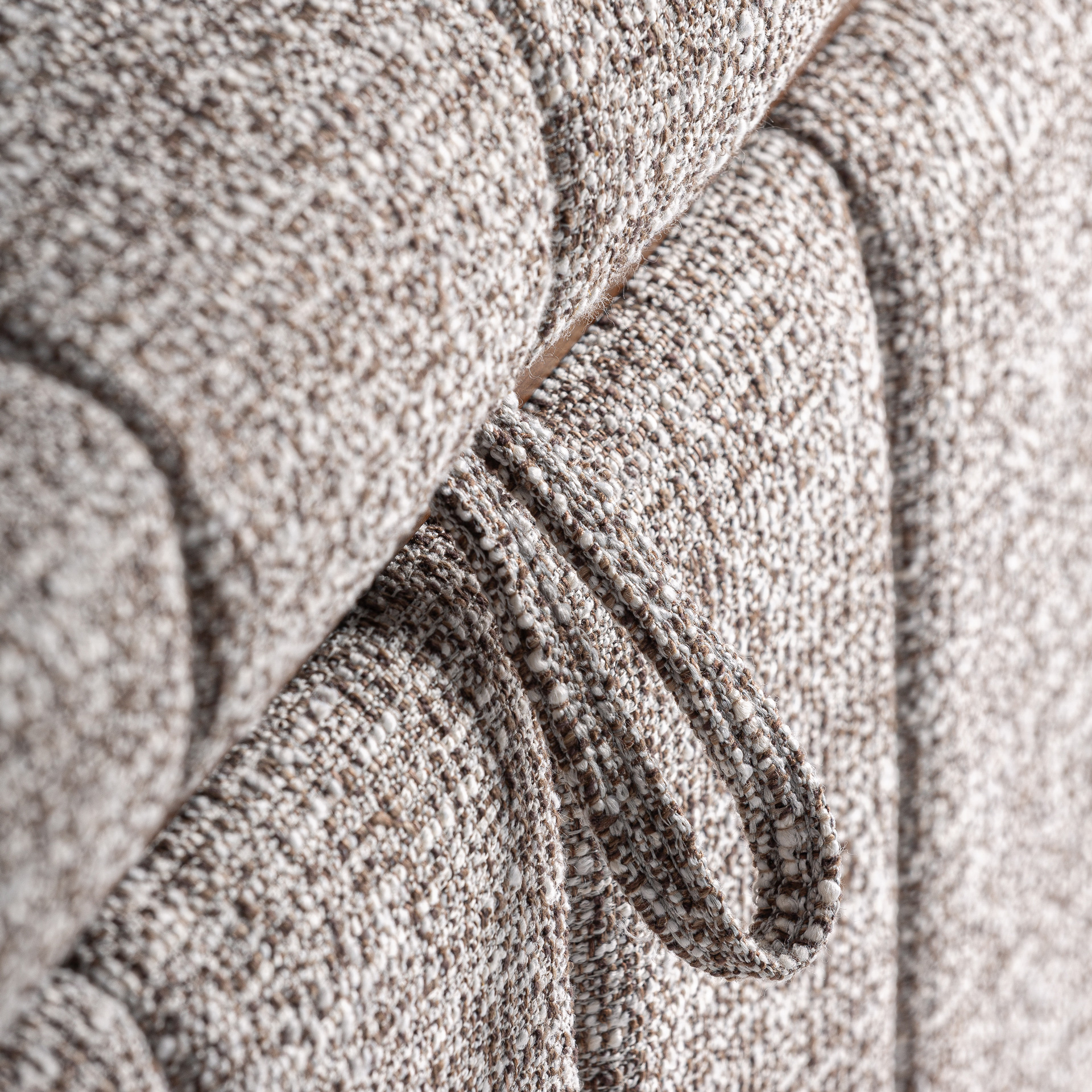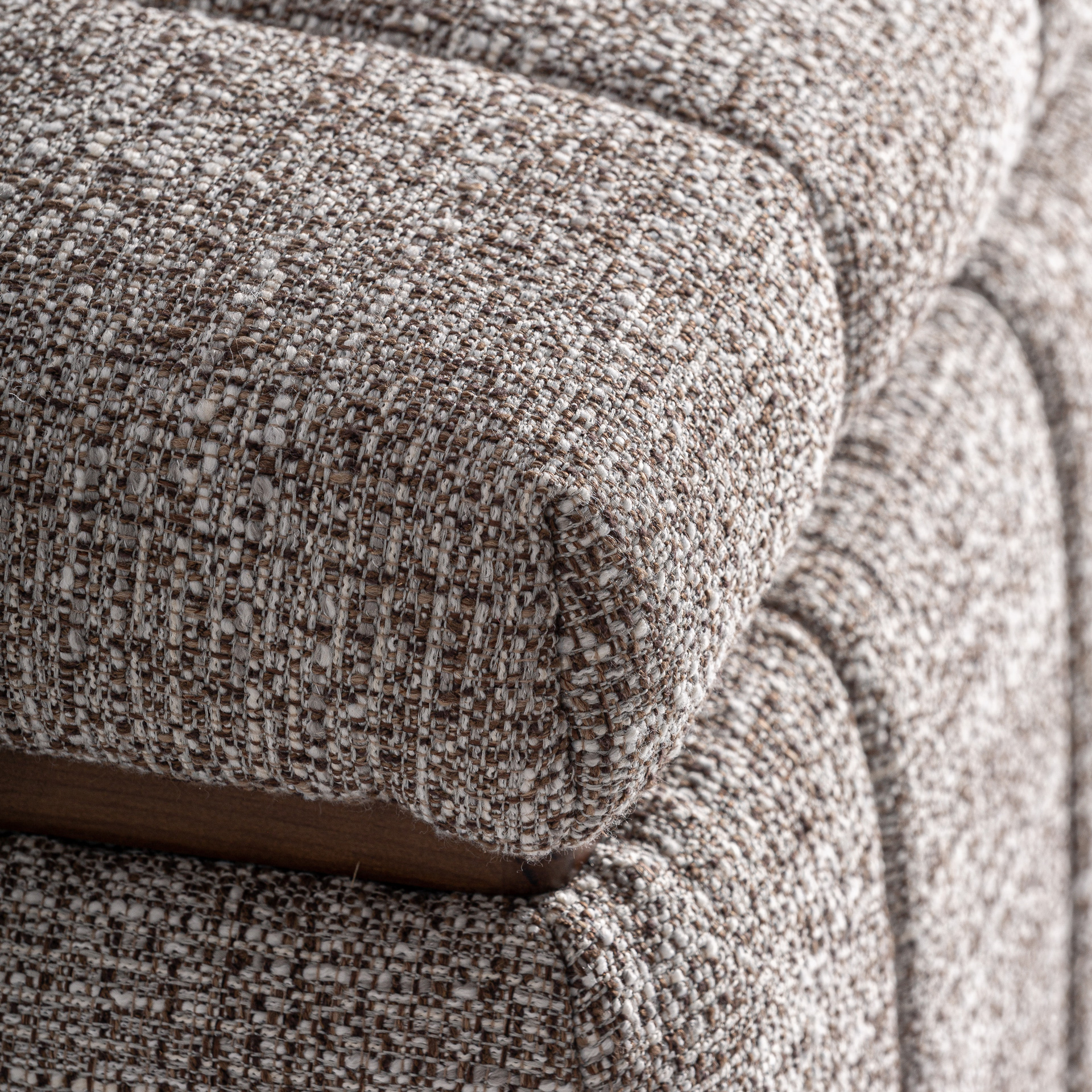 Pie de cama Ontoria de estilo contemporáneo, fabricado en poliéster en color gris con acabado jaspeado, combinado con madera roble en color marrón y espuma.