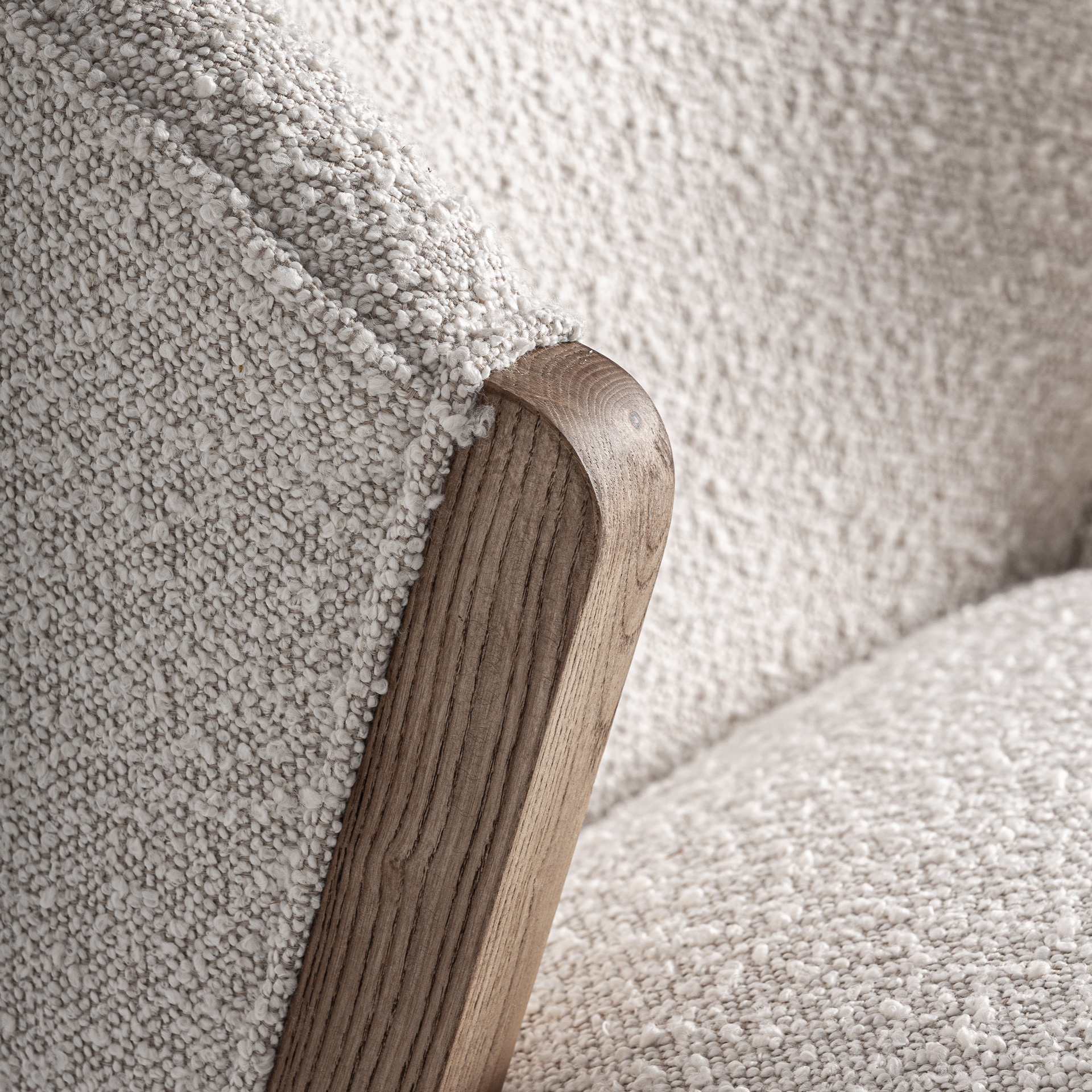 Silla Prati bouclé de estilo contemporáneo, fabricado en madera de pino en color marrón, combinado con algodón bouclé en color blanco roto.