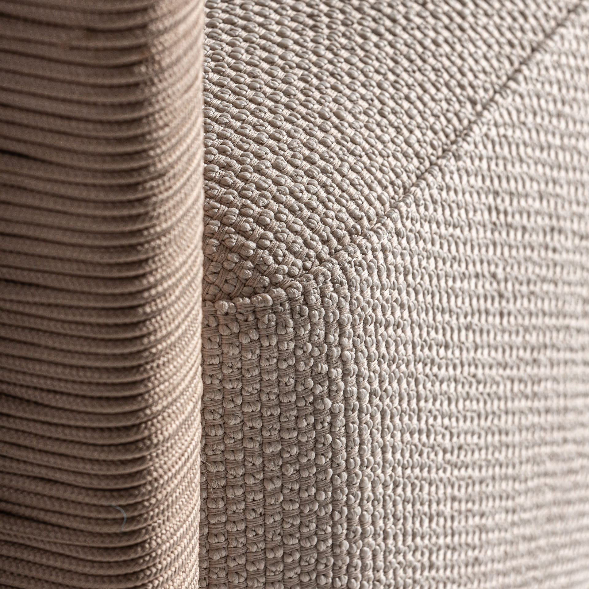 La elegancia de la colección Trena es la suma de dos conceptos: ligereza y contundencia. El respaldo se muestran como una pieza envolvente, que abraza todo el conjunto, creando un espacio íntimo, donde la cuerda es el material protagonista. En el sofá el ratán descansa sobre una tarima de madera de teca reciclada: una estructura que lo sostiene, lo eleva y le aporta una sensación de ingravidez, delicada y sutil.