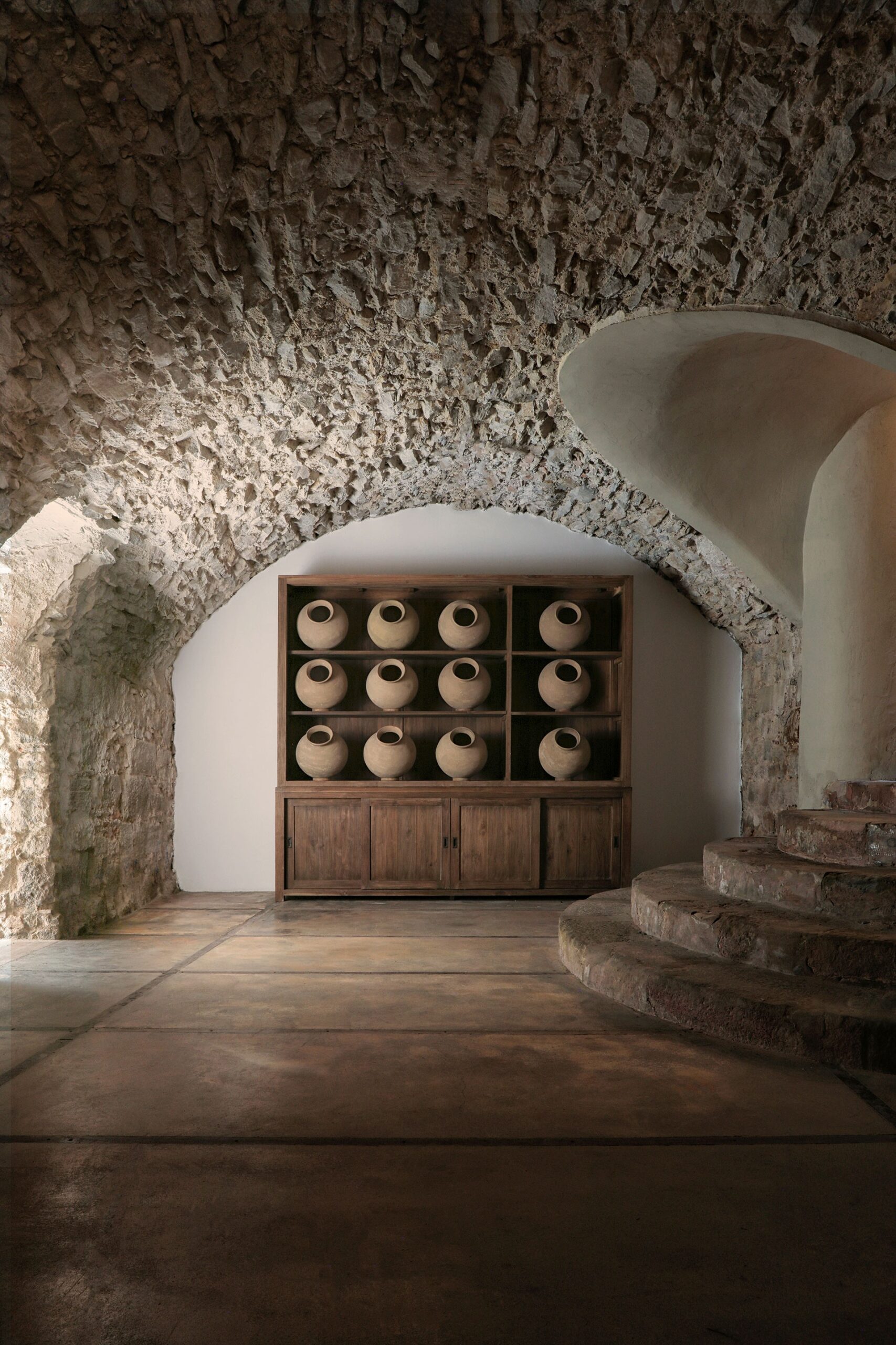 Vitrina en teca reciclada marrón es perfecta para exponer vajillas o libros con estilo sereno.